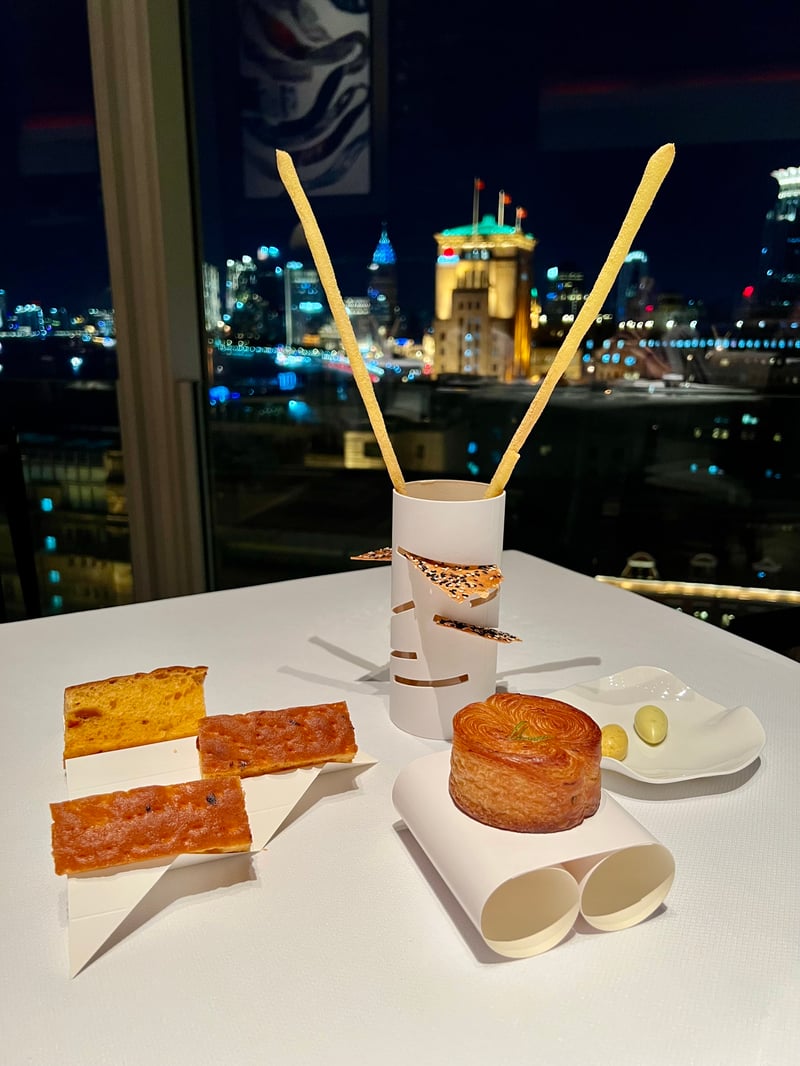 The bread service arrives as a small performance of its own. Thin breadsticks stand upright like clean graphic lines; a soft, lightly golden focaccia offers gentle contrast; delicate seeded crisps add aromatic crunch; and a small flaky roll immediately draws attention. Its airy, buttery layers reveal a subtly caramelized sweetness upon tasting.