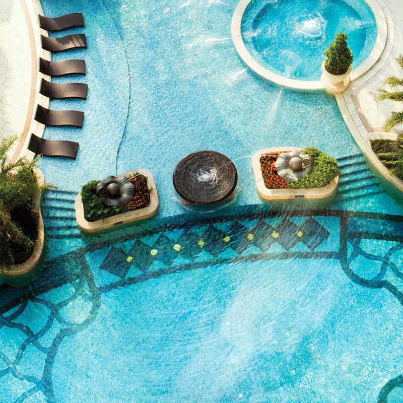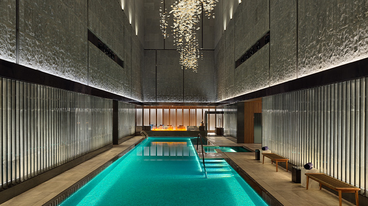 André Fu's design philosophy courses through this 51-story tower overlooking Qianhai Bay, where floor-to-ceiling windows frame the Shenzhen skyline from every angle. Rooms showcase intricate marquetry woodwork, timber screens, and Carrara marble bathrooms, while emerald furnishings anchor spacious living areas. The sky-high indoor pool, surrounded by cabanas and banana leaf trees, appears to float above the city. A stone-and-wood spa with four intimate treatment rooms completes the retreat.