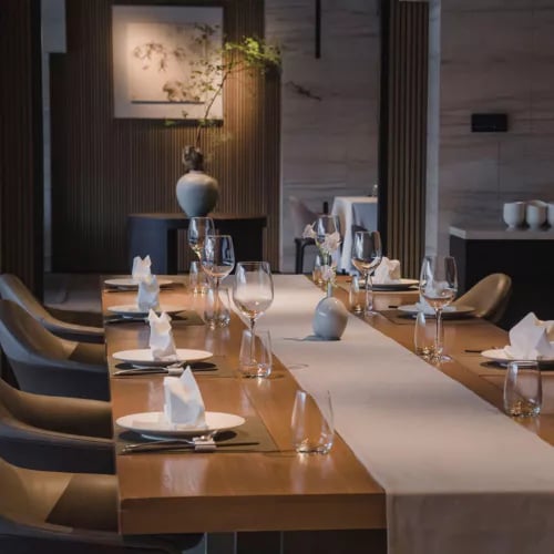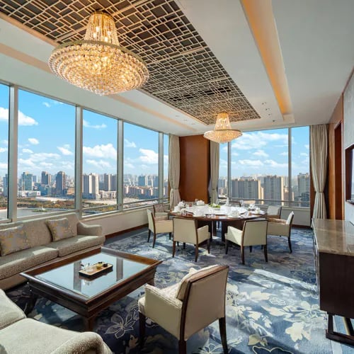 A Michelin-starred table within the Shangri-La, Shang Palace pivoted from Cantonese cooking to embrace the refined traditions of Huaiyang cuisine. The young, formally trained chef channels regional heritage through his inventive "new three heads"—mugwort-scented lion's head meatballs, pig's head terrine brightened with finger lime, and a fermented sour broth cradling deboned fish head. The modern Chinese dining room provides elegant staging for these bold reinterpretations.