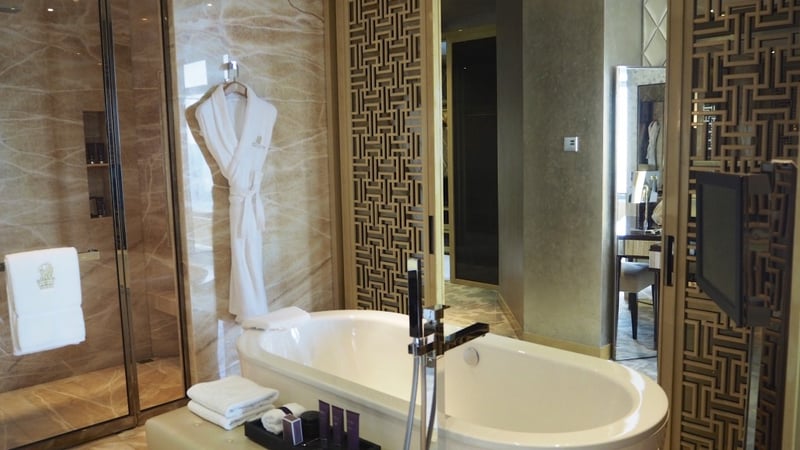 The arrival is princely: splendid cars are parked in front of the hotel, some more beautiful than others. Here we are in a palace, the tone is set! From the lobby on the 103rd floor, I am astound by the beauty of the place: a very elegant decoration with dark colors. When I arrived around 2pm, it was bustling with people: you have to say that this hotel offers 312 rooms which is far from the privacy you can find in a boutique hotel.