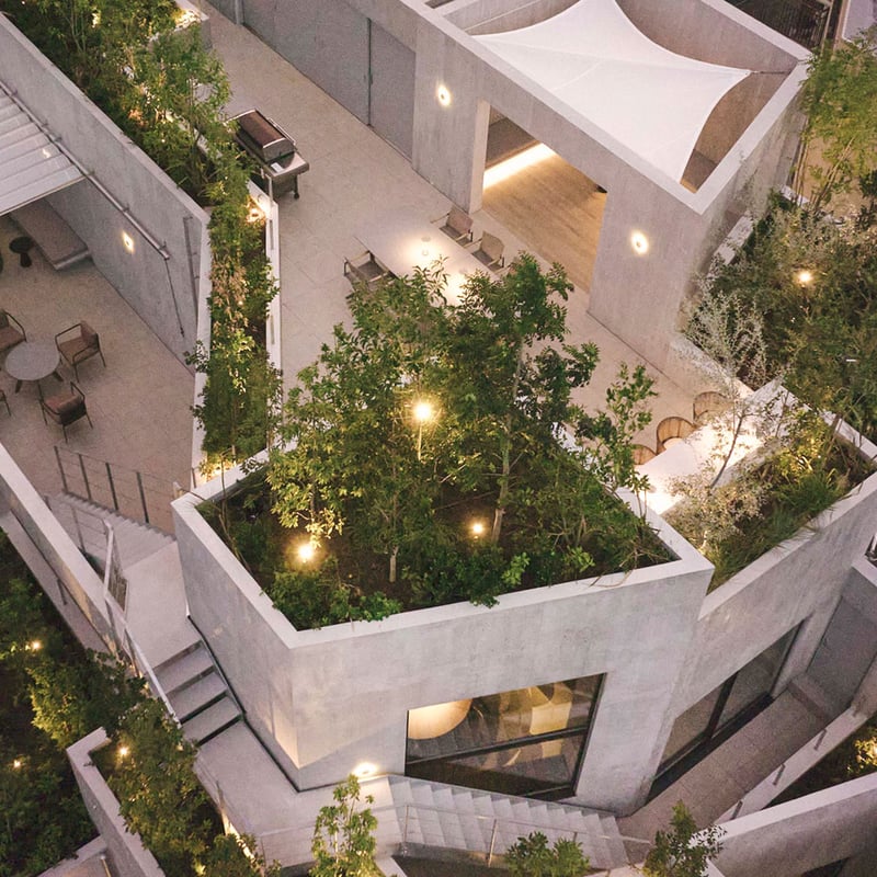 Eight residences occupy this architectural experiment where vertical gardens climb through bold structural forms. Each space—Sound, Bar, Atelier, Retreat—functions as a short-term dwelling rather than conventional accommodation, with oversized windows framing Fukuoka and statement furnishings anchoring interiors designed for extended stays. The experimental lighting shifts between functional and atmospheric, serving creative professionals and design-minded travelers seeking domestic scale with hotel flexibility.