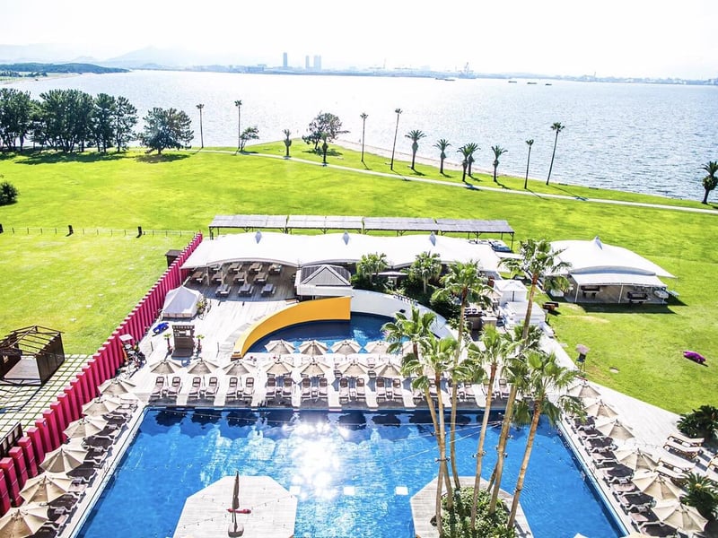 Facing Hakata Bay from a seaside park twenty minutes outside Fukuoka, The Luigans offers 98 rooms split between crisp white minimalism and colonial-inflected rattan décor with ceiling fans. Tennis courts and gardens extend the resort grounds toward sandy beaches, while Italian Acca Kappa toiletries and complimentary mini-bar drinks add quiet indulgence. A rare coastal escape within easy reach of city and airport alike.