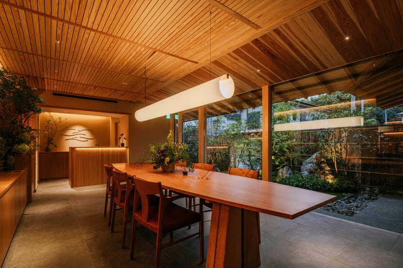 Two decades of patient landscaping and hot spring excavation by a visionary owner have shaped this remote Kagoshima retreat, where the dining experience draws directly from the surrounding forest. Vegetables arrive from the property's garden, chickens are raised on-site, and the terroir-driven menu shifts with the seasons—all served against panoramic views of Mount Kirishima's volcanic peaks rising through the woodland canopy.
