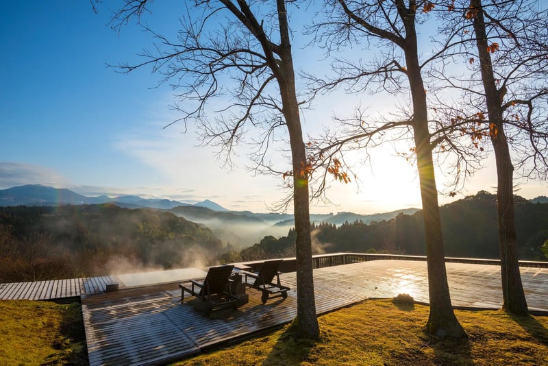 Deep within Kagoshima's forested highlands, three private villas survey the volcanic silhouette of Mount Kirishima—the culmination of their owner's twenty-year labor shaping these woods and excavating natural hot springs. Each residence offers its own onsen and open-air bath for unhurried soaking. The kitchen draws from an on-site farm, serving seasonal vegetables and house-raised chicken. A retreat for travelers seeking profound stillness.