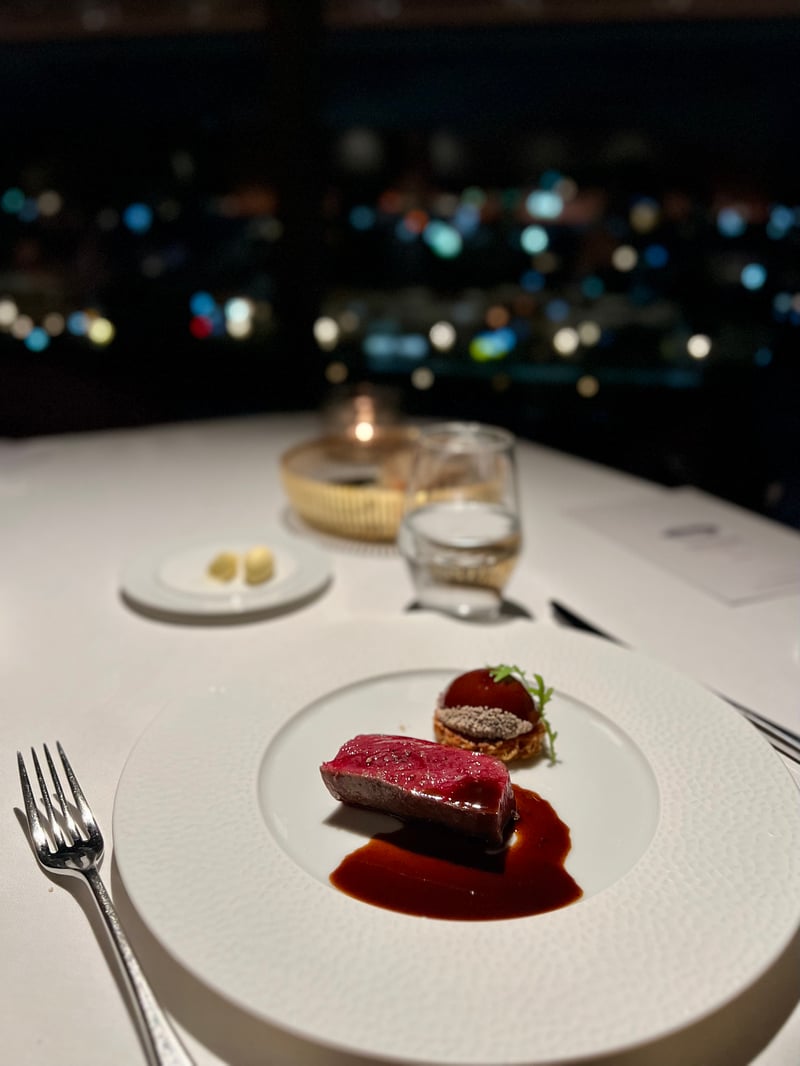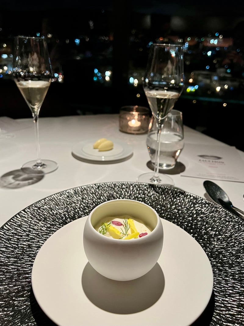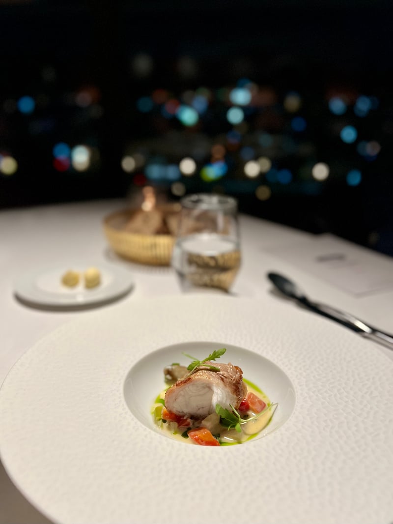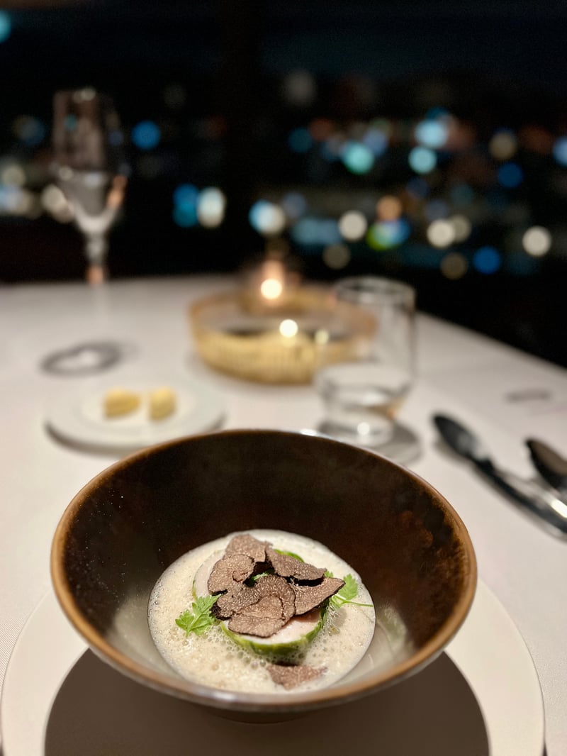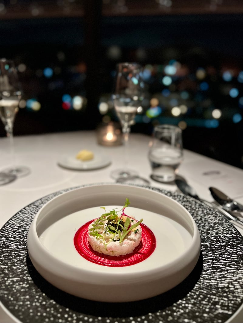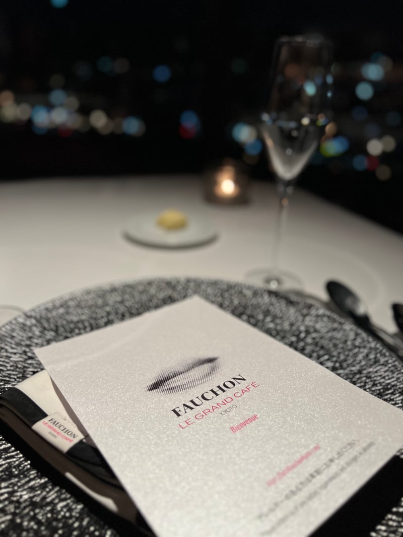 Kyoto, though renowned for its delicious traditional dishes, also stands out as a prime destination for international haute cuisine, embodied brilliantly by the prestigious Grand Café Fauchon. We had the privilege of enjoying a memorable evening at this restaurant during a festive December month, where the Christmas menu was featured from December 1 to 25. Upon arrival, we were warmly welcomed and led to a meticulously set table facing the large bay windows offering a breathtaking view of illuminated Kyoto. The venue's elegant atmosphere, combined with the city's charm at night, creates a magical and intimate ambiance, perfect for a celebratory dinner. With a glass of Fauchon champagne in hand, we perused the menu designed by the restaurant's executive chef and Parisian chef Sébastien Monceaux. Two festive menus were offered, but we chose the 'Noël Fauchon' menu, a true ode to refinement and delicacy, perfect for marking the year's end festivities.