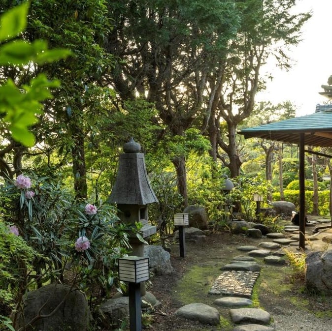 White walls and green copper roofing styled after castle architecture crown this 27-room landmark overlooking Mikawa Bay and Takeshima Island. Art Deco chandeliers and elevator details survive in the lobby, while the grounds preserve a hexagonal 1936 annex and a wooden sukiya-shoin structure from 1916. Babe Ruth and Lou Gehrig slept here during their Japanese exhibition tour—their rooms still noted today.