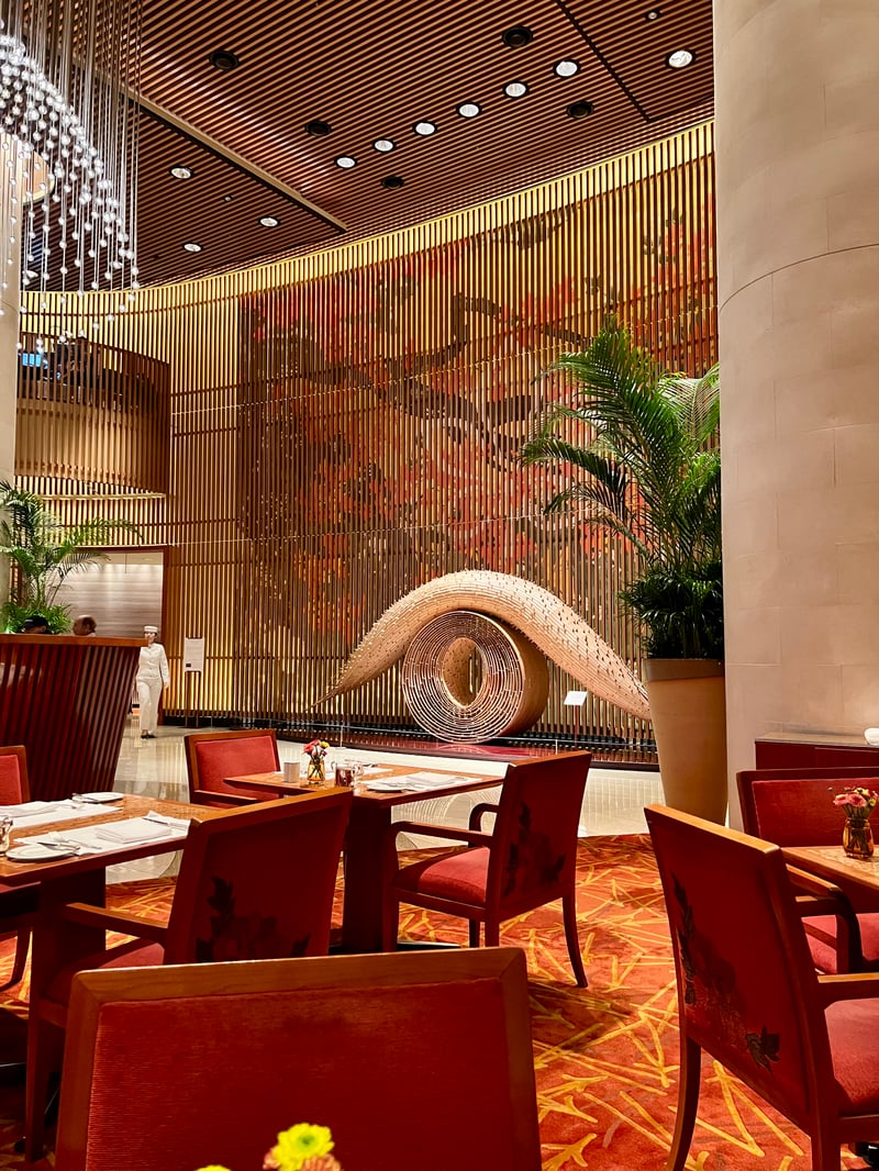 The lobby of The Peninsula Tokyo is a true work of art, where elegance and warmth blend harmoniously. At the heart of this sumptuous space is the iconic sculpture Lying Dragon Gate, a captivating piece that evokes an immense wooden eye, symbolizing the balance between tradition and modernity. The atmosphere is enhanced by the use of dark wood and sumptuous fabrics, creating a refined and welcoming ambiance. This place is not just a spectacular entrance but also a popular meeting point, attracting both Tokyoites and international travelers seeking excellence.