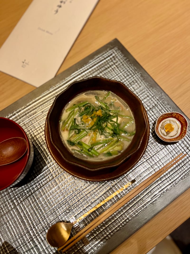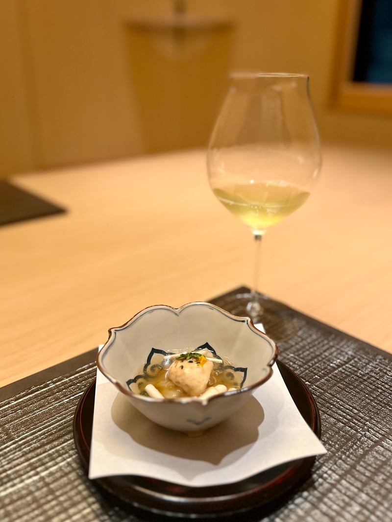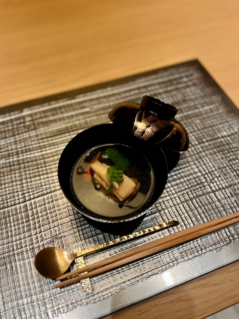 After these delicate starters, we discover a soup course featuring a delicately prepared clear broth, highlighting the finesse of Japanese cuisine. At the center of the bowl, a crab and tofu fritter brings a crispy texture, harmoniously accompanied by bamboo shoots and turnip greens that add a dimension of freshness and lightness. The whole is elegantly garnished with carrots and Japanese pepper leaves, adding a final touch of color and subtle flavor.