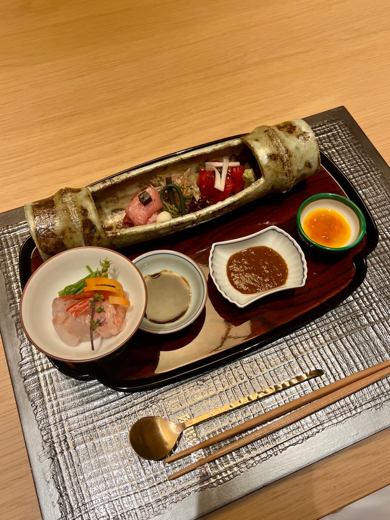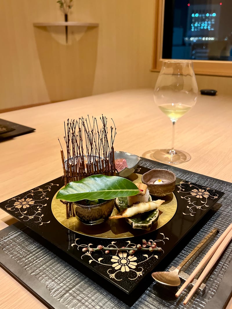 Continuing our culinary exploration, a delicately adorned platter reveals an exquisite selection of starters with refined aesthetics. The Salt-Steamed Duck Breast rests elegantly beside Kinpira Udo Root, draped in a kumquat sauce that promises an explosion of flavors. Alongside, the Simmered Baby Octopus is accompanied by rapeseed flowers, bringing a touch of spring freshness. The marinated Mountain Vegetables add an earthy note, while young spring onions, or Hirokko, blanched, pair with fern shoots and fried dried squid, offering contrasting texture. A Spring Roll of Sakura shrimp and cheese catches the eye with its promise of crunch, while the Vinegared Sea Cucumber and yuzu-grated yam add an acidic dimension. Finally, the Simmered Conger Eel Sushi brings a final touch of refinement to this harmonious culinary composition.