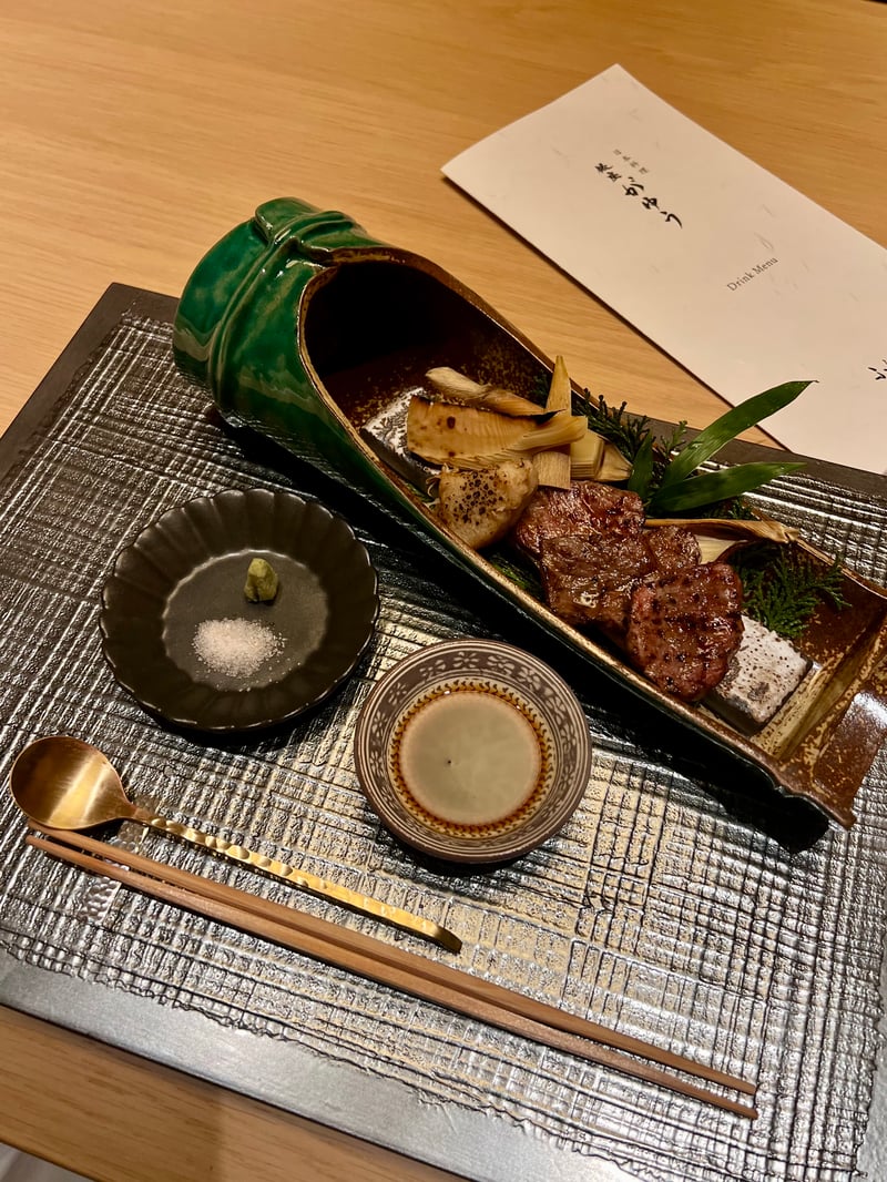 The culinary journey continues with an exquisite dish of charcoal-grilled Japanese Black Wagyu beef, elegantly arranged alongside pieces of taro root, known as Ebi-imo, and bamboo shoots. The beef, renowned for its tenderness and rich taste, is elevated by an accompaniment of salt, wasabi, and a special house sauce that enhances each bite.
