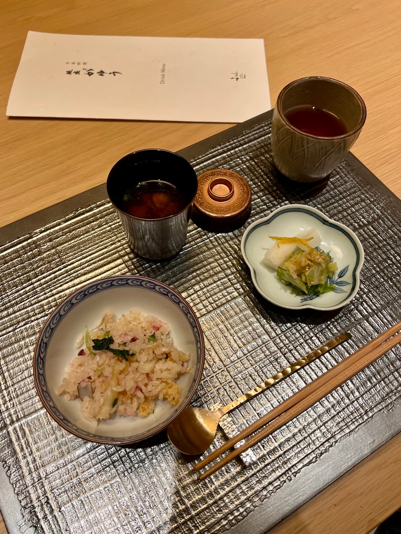 To conclude the savory creations, a delicious bowl of pot-cooked rice arrives, topped with white fish tempura, lily bulbs, burdock greens, pickled red ginger, and white sesame. The subtle flavors and varied textures blend harmoniously, creating a delicate and balanced culinary experience. Alongside, a small bowl of red miso soup accompanies this dish, adding comforting umami depth.