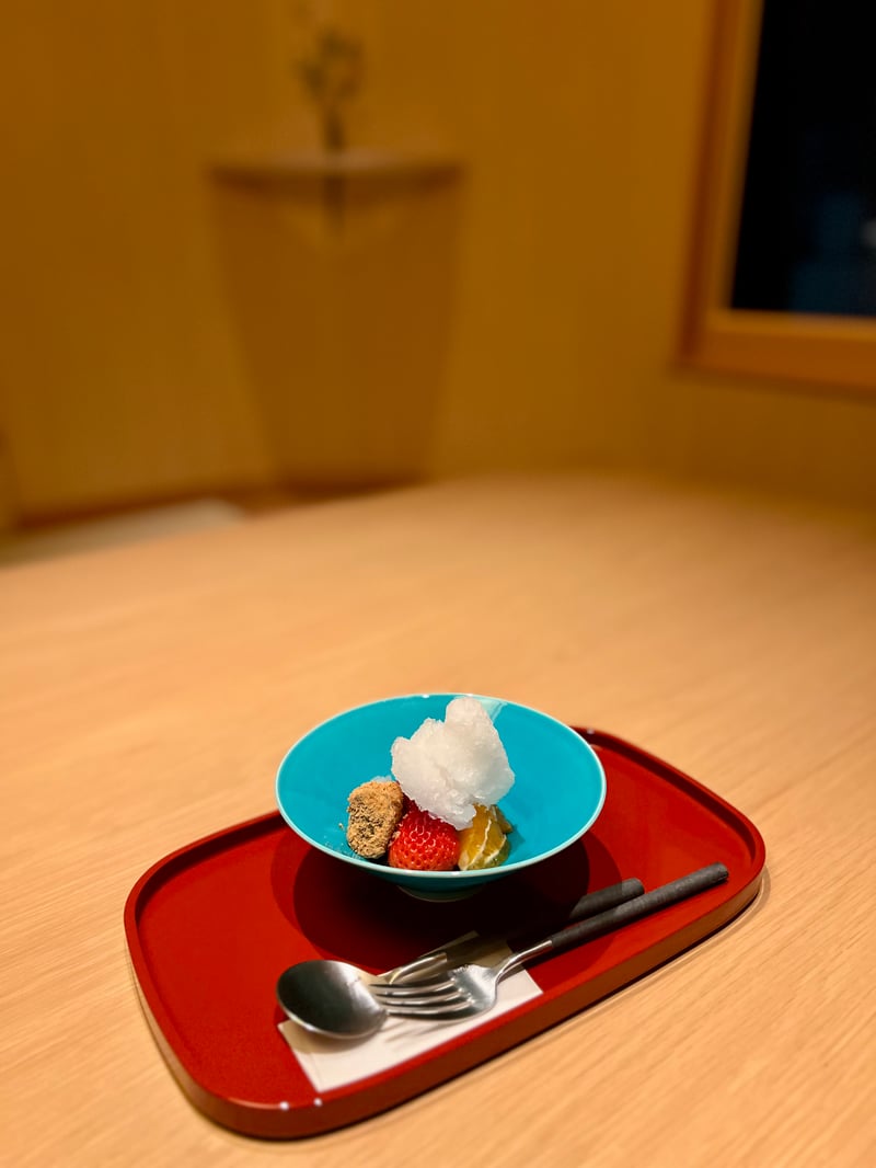 To conclude this feast, a refined dessert features Warabi Mochi in the form of a translucent and delicate jelly made from bracken starch. Served in a striking blue bowl, this light dessert is adorned with fresh strawberries and Dekopon citrus, offering an explosion of fruity flavors. The shaved ice added on top brings additional freshness, creating a pleasant contrast with the sweetness of the mochi. Perfect for ending a meal on a sweet and refreshing note, this dessert is a magnificent example of the subtle harmony of Japanese confectionery.