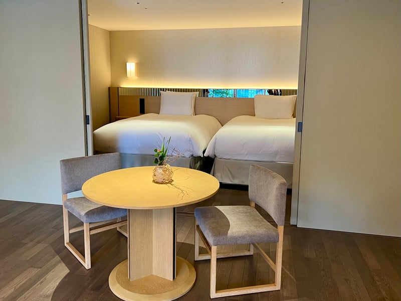 During our stay, we had the privilege of discovering a Premium Suite—a space of 94 to 98 square meters that embodies the pinnacle of comfort and elegance. This spacious suite is designed to offer absolute relaxation, with two SLEEPLEASURE double beds and a bathroom featuring a hinoki cedar wood bathtub. The wraparound balcony garden, characteristic of each suite, offered us breathtaking views, reinforcing the impression of being in a haven of peace. Every detail, down to the elegant pajamas provided, contributes to creating an immersive and luxurious experience. True to the spirit of Japanese ryokans, guests are invited to wear them everywhere—from the rooftop bar to the private dining rooms—for an even more immersive experience.