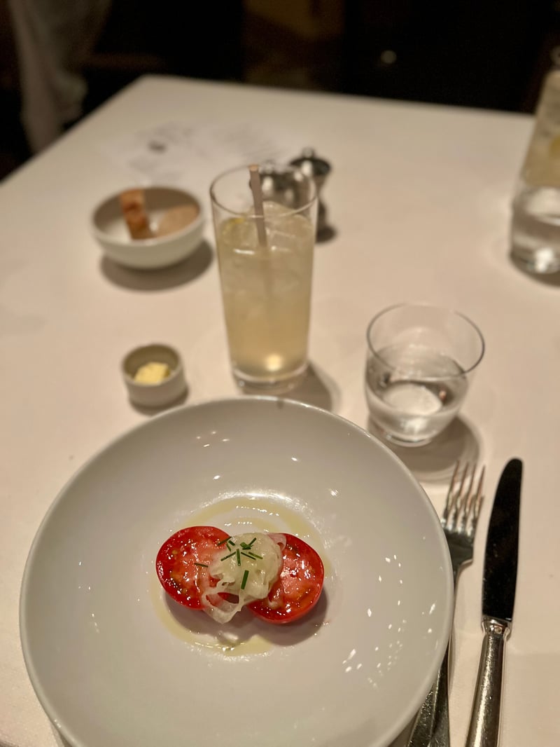 For our dinner, we chose the Steakhouse Set, a menu designed as an ascending journey where each dish prepares the palate for the next. The experience opens with the Fruit Tomato – Organic Sweet Onion, Extra-Virgin Olive Oil, a deceptively simple yet incredibly elegant starter. Two halves of a fruit tomato, bright red and glistening, rest at the center of a pristine plate. Their juicy flesh reveals a natural sweetness enhanced by a drizzle of extra-virgin olive oil. On top, a translucent veil of organic sweet onion adds a crunchy, subtly sweet note, while a few sprigs of chives awaken the dish with a fresh herbal nuance.