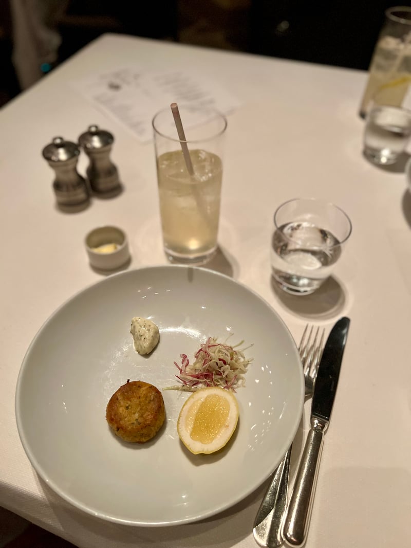 As a transition toward a more indulgent register, the Crab Cake – King Crab and Snow Crab Meat, Rémoulade Sauce arrives like a small promise of briny pleasure. Golden on the outside and tender inside, it contains a generous mix of king crab and snow crab. Beside it, a creamy and lightly tangy rémoulade awaits to be paired with the still-warm crab meat. A small salad of finely shredded cabbage brings a refreshing note that perfectly balances the dish, ideally preparing the palate for what follows.
