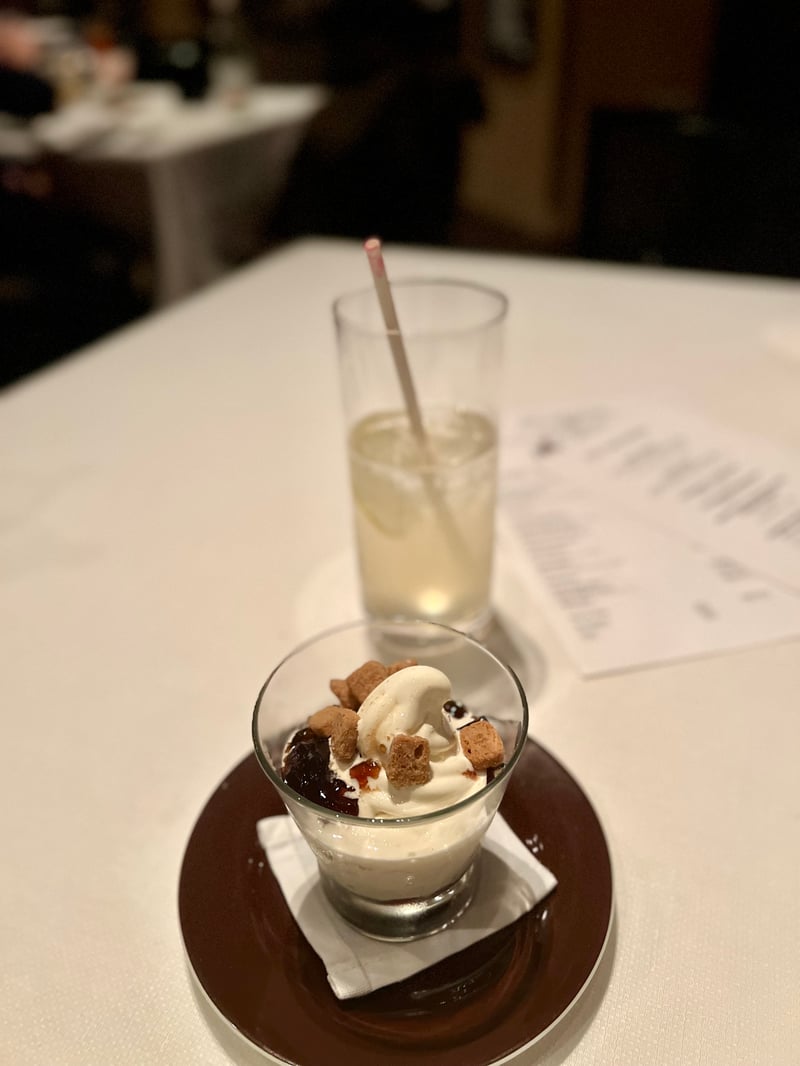 To finish the dinner beautifully, the Japanese Whisky Sundae – Brown Sugar Jelly, Crumble offers a dessert that is both refined and pleasantly nostalgic. In a transparent glass lies a creamy base paired with a deep, slightly caramelized brown sugar jelly. On top, a swirl of Japanese whisky ice cream adds a woody, slightly smoky touch. A few bits of golden crumble provide a crunchy note that contrasts deliciously with the softness of the other textures. A gourmet finale, perfectly balanced, where the sophistication of whisky meets the tenderness of a sundae executed with finesse.