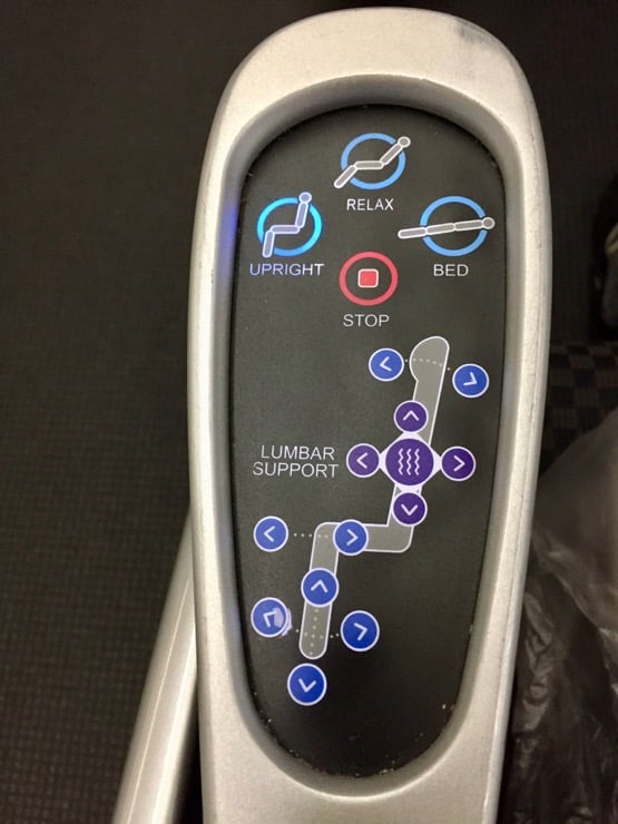 The seat's control panel is highly intuitive, and with a few clicks can be configured according to our wishes. This comes with a 15-inch screen and a top-notch pair of noise-cancelling headphones. In terms of storage we're of course quite spoiled, with several pockets to hold our magazines and other personal items.