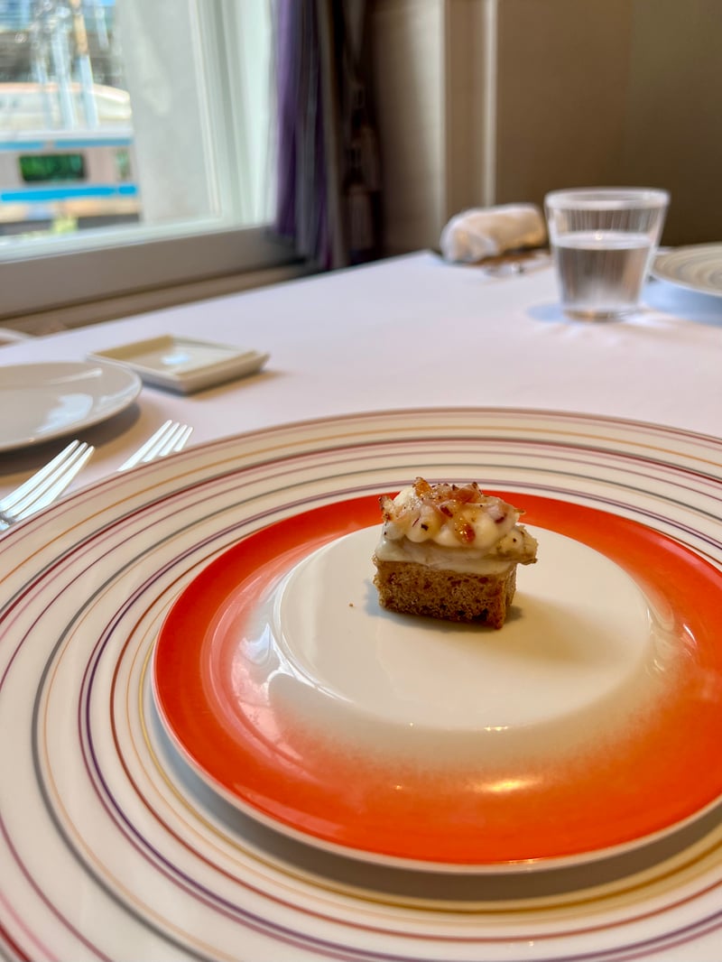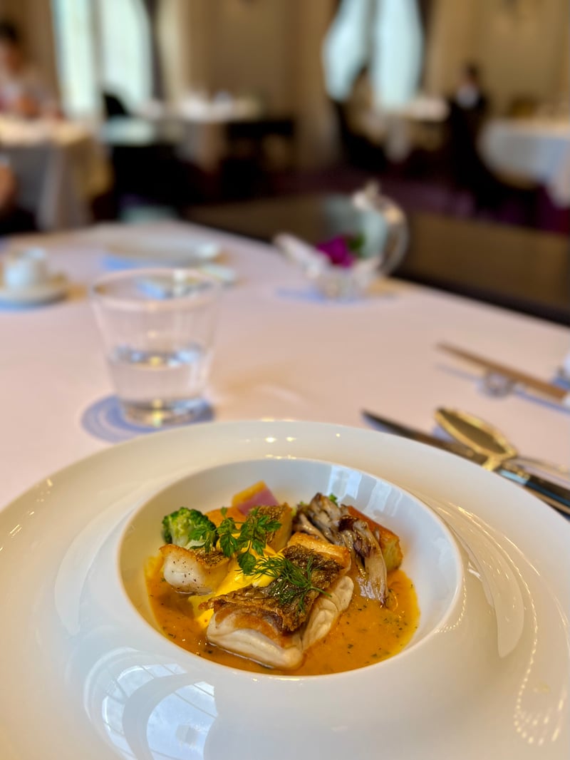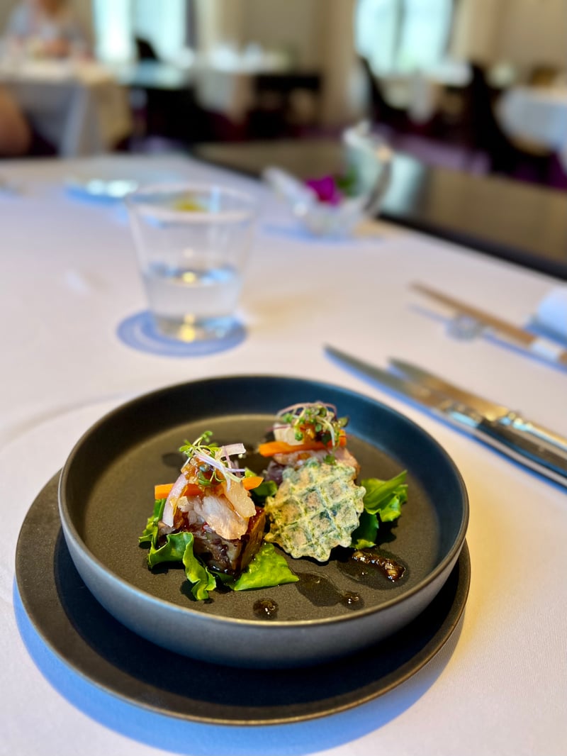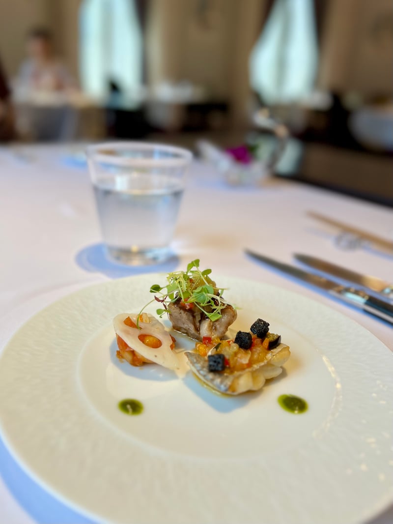 We opted for the 'Dégustation du Midi' menu, a true festival of refined flavors. From the very beginning, delicate amuse-bouches, both subtle and elegant, opened this gastronomic journey with exquisite finesse. The first course revealed a carefully orchestrated harmony between crab, chicken, and vegetables, offering a play of textures and flavors that awaken the senses. Then, a bold and refined combination took over, marrying the freshness of tuna with the richness of black pork, enhanced by expertly prepared vegetables.