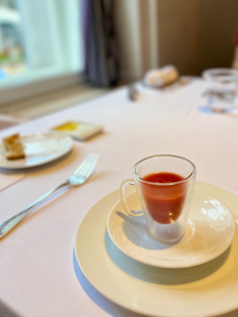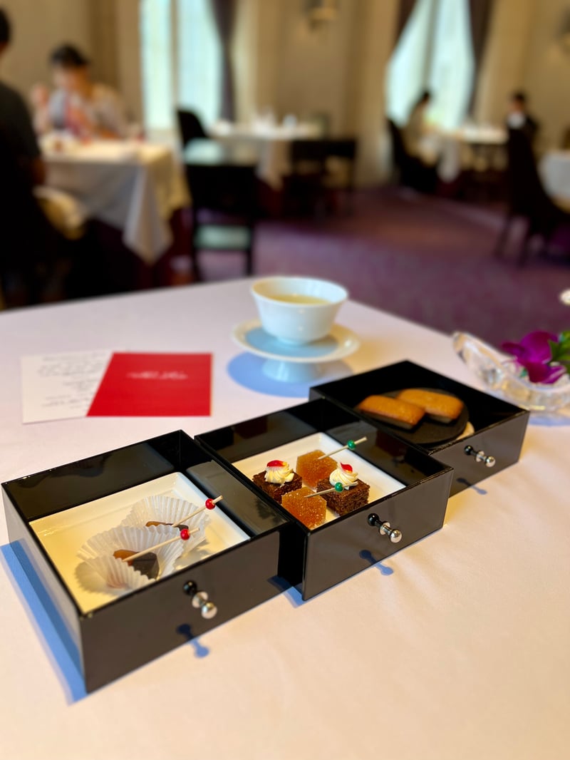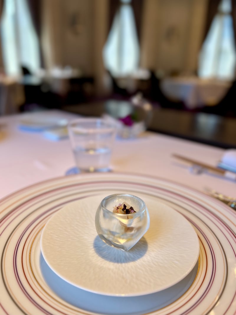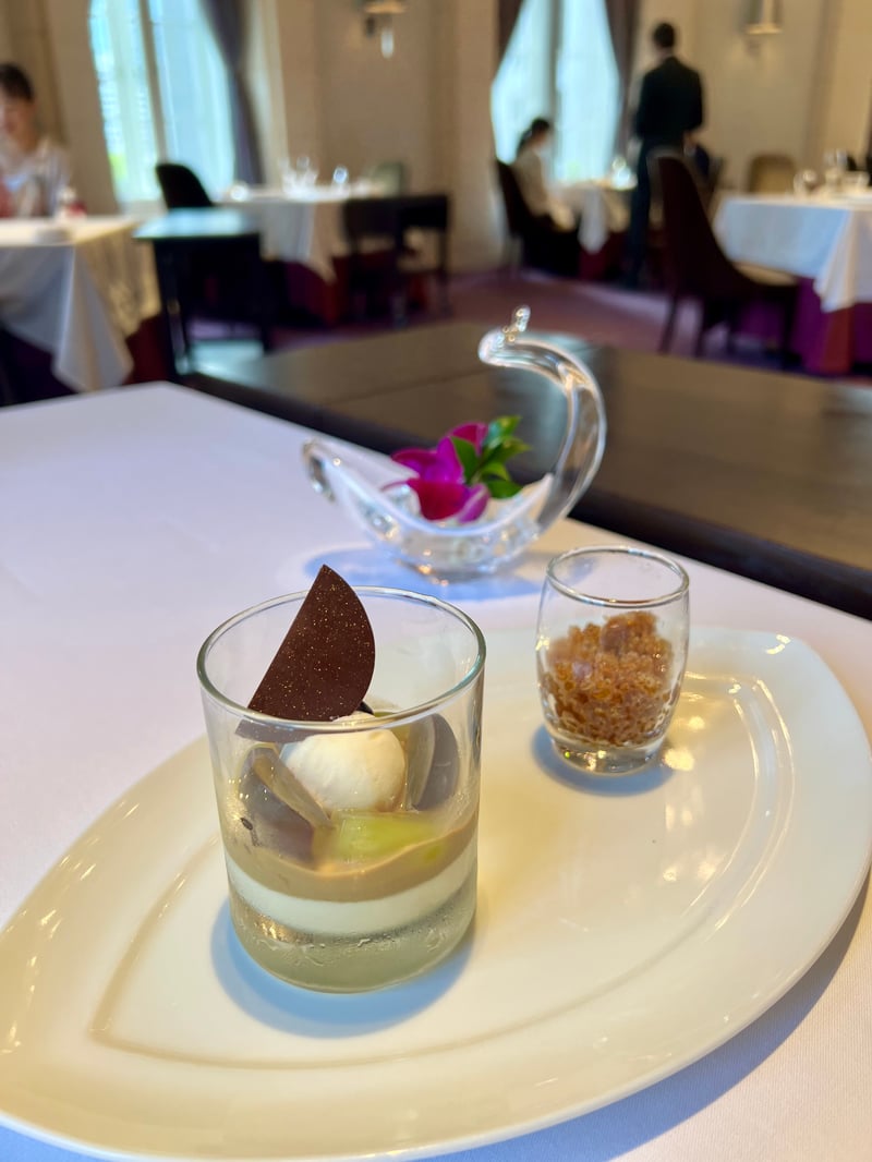 Before concluding on a sweet note, the pre-dessert centered around fig charmed us and served as an ideal prelude. Finally, the dessert was a masterpiece of balance, blending the fruity flavors of grape with the sweetness of mascarpone and the lightness of cream cheese. To close this gastronomic experience, tea accompanied by petit fours added a final touch of comfort and refinement.