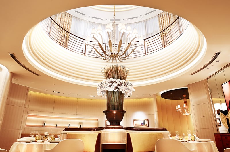 The restaurant interior comes to us thanks to designer Pierre-Yves Rochon. The themes are white, gold, transparency, glass, and light, and the result is impressive. A few flashy art pieces enhance the room's appearance, which on the whole displays an elegant and refined style.