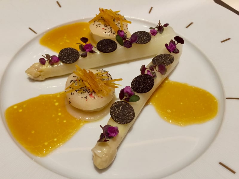 The meal begins with a very refreshing hors-d'oeuvre to prepare our palates for the explosion of flavors that will soon follow. The procession of dishes continues with a highly anticipated appetizer: white asparagus, shiso flowers, black truffle, and scallops. The flavor is divine, and the presentation demonstrates perfect mastery. Even though the chef himself has told me that his cuisine is essentially focused on ingredient combinations and taste, the food's appearance is clearly not an afterthought—it's a sight for sore eyes! This is what I love about Japan, where finesse and aesthetics are extremely important.