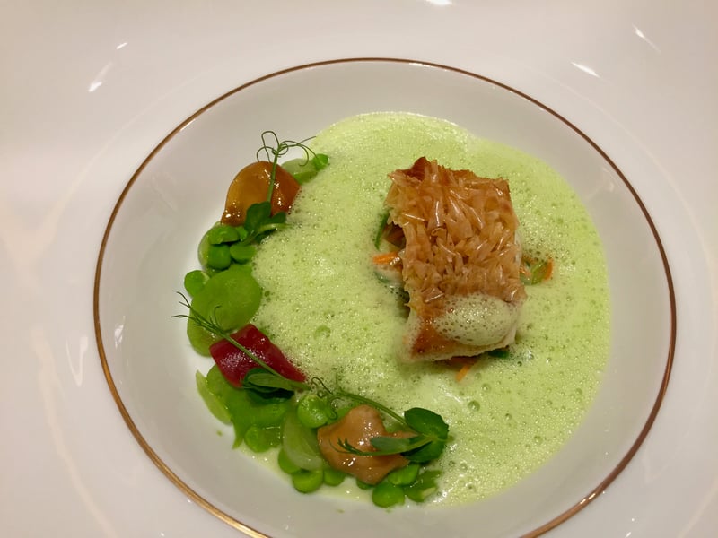 Next, it's time for seafood to make its entrance: for the first time, I will try kinmedai, a fish with firm flesh that is rarely eaten in France, accompanied by an emulsion of peas and broad beans. It's perfectly cooked, and the association of flavors is once again excellent. The chef has told me that the local region is a fantastic playing field when it comes to this fish. The richness of seasonal Japanese ingredients available, including fish, crustaceans, and vegetables, is an ideal base for his cuisine.