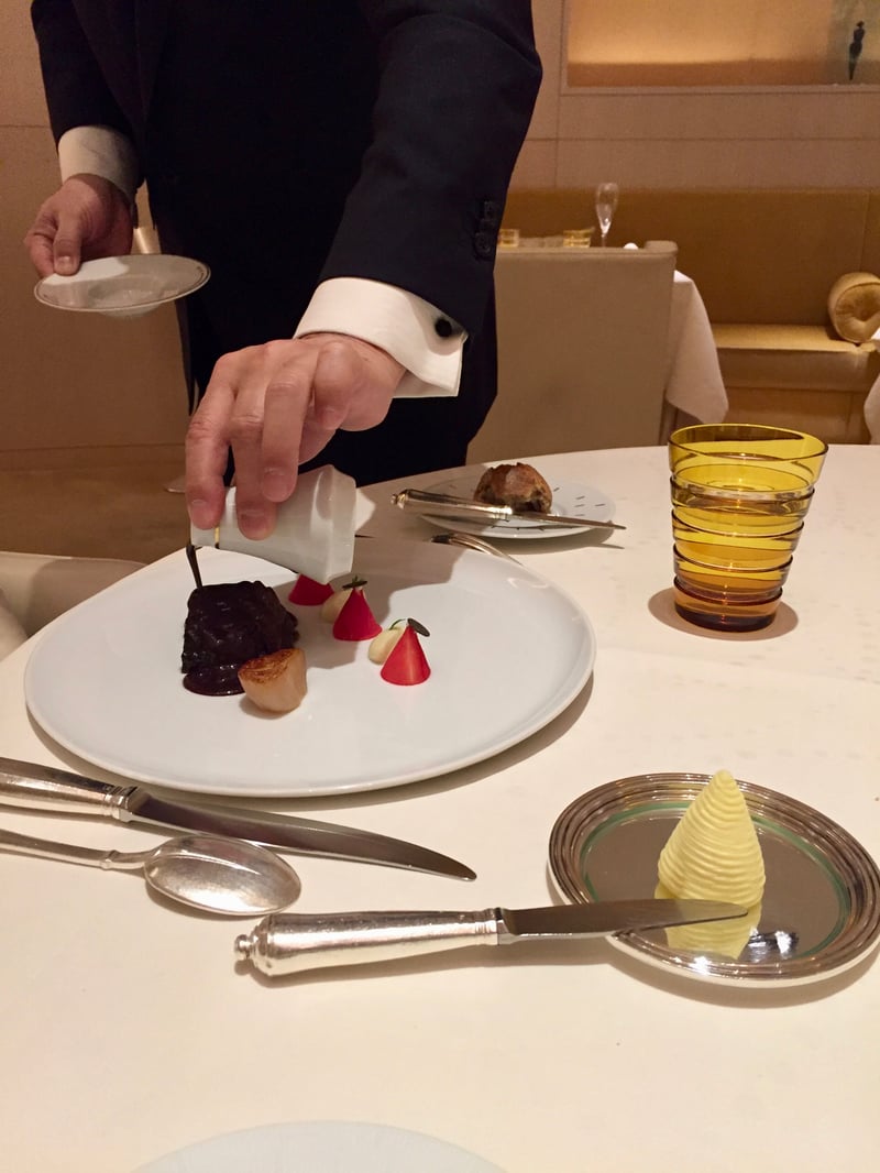 For lunch, I can eat à la carte, or choose one of two possible set menus: one is a lunch menu for 10,000 yen (about 76 €), the other a “les belles gourmandes” set menu for 14,000 yen (about 104 €). The meal is rather affordable for a restaurant with two Michelin stars when you compare it with the prices you might find in New York or Paris.
