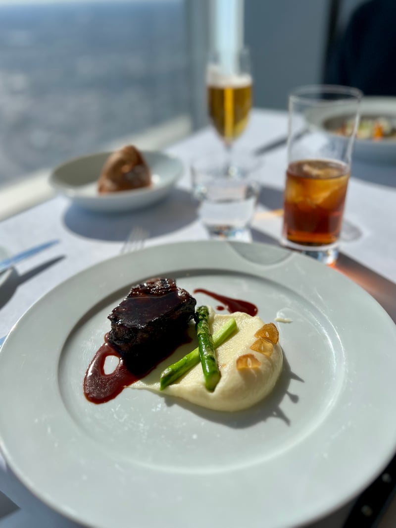 Continuing this culinary journey, my husband, drawn by the prestigious selection of steaks, chose the grilled F1 Japanese Beef that reveals itself majestically on the plate. This ribeye is accompanied by a velvety potato purée and green asparagus, adding a touch of freshness and color. Golden garlic chips bring a crispy, fragrant note, while the intensely savory beef jus elevates the whole. Presented with elegance, this dish embodies the perfect harmony between the meat's tenderness and the richness of its accompaniments, ideal for a luxury gastronomic experience.