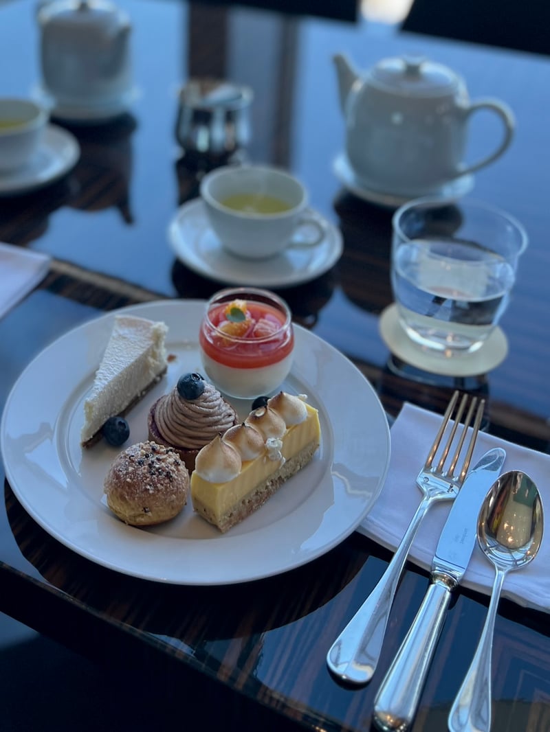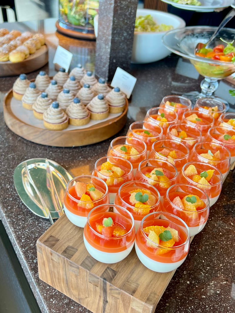 To end on a sweet note, dessert, also served buffet-style, offers an exquisite variety of treats, ideal for accompanying coffee or tea. On the plate, chosen from a multitude of options, one discovers a Mont Blanc tartlet garnished with a velvety mousse and topped with a fresh blueberry, adding a touch of color and freshness. Beside it, the famous New York cheesecake is a restaurant signature not to be missed. A small coffee cream puff stands out for its lightness, while a red berry panna cotta completes this selection. Finally, a lemon meringue tart finishes with a bold zest. The ensemble creates a harmony of textures and flavors, perfect for an indulgent pause.