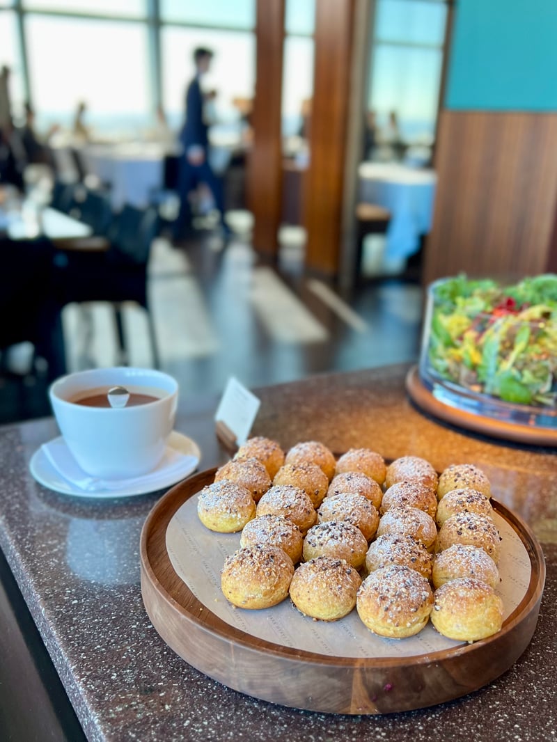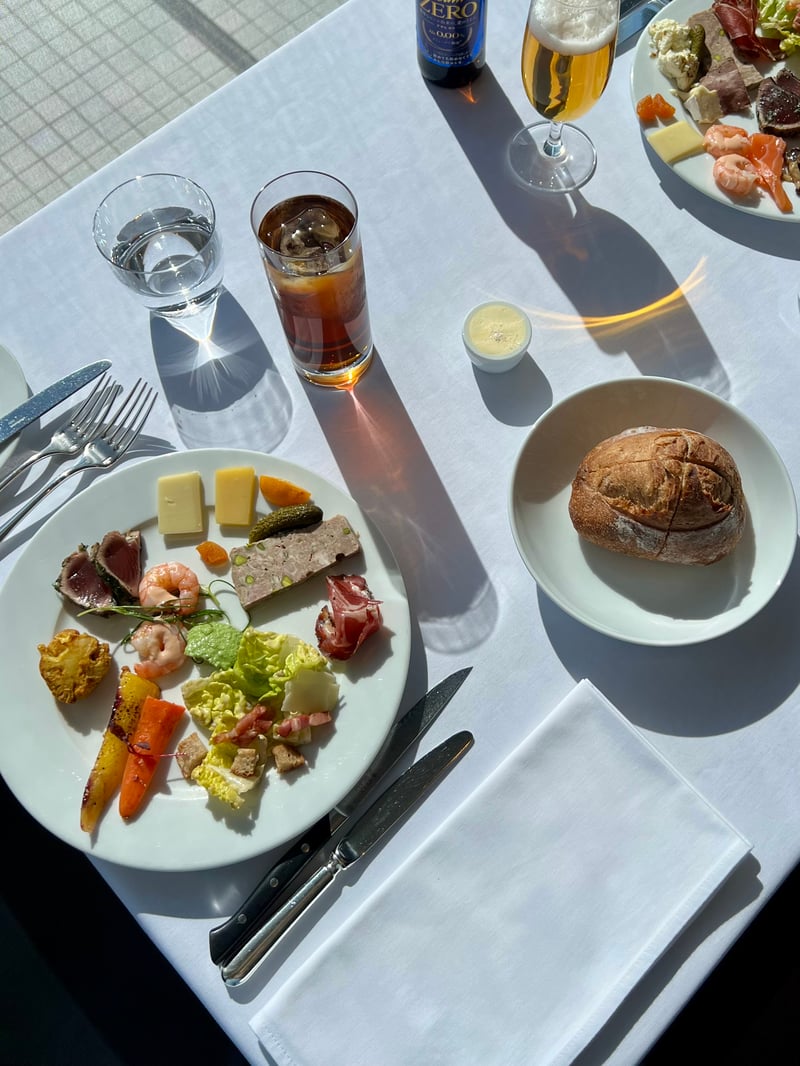 New York Grill offers an unforgettable culinary experience for lunch, where the elegance of modern American cuisine harmonizes subtly with Japanese influences, all enhanced by a breathtaking panoramic view of the city, even more dazzling on clear days. The lunch menu distinguishes itself with a refined selection of dishes, including starters and desserts served buffet-style. Guests are invited to help themselves from a multitude of gourmet choices, creating a true visual feast. I selected a variety of delights reflecting the buffet's richness: thin slices of cured meat alongside cheese pieces with pronounced flavors, while pink shrimp added an elegant marine touch to the ensemble. I also opted for a country pâté, rich in flavors, accompanied by roasted vegetables such as peppers and carrots bursting with vibrant colors. A Caesar salad brought a welcome freshness, complemented by pieces of grilled bread and a small artisanal bread roll to accompany each bite of this varied and refined palette of flavors.