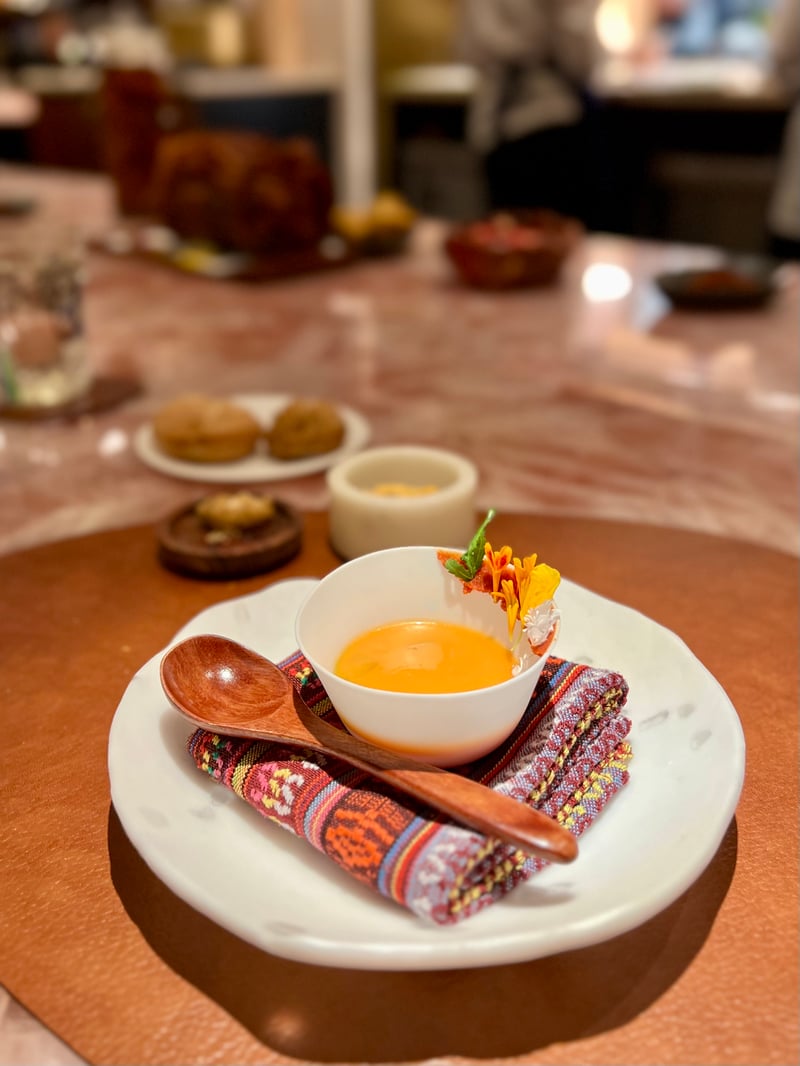 The culinary experience offered by the Taste of Araya menu begins with an exquisite selection of snacks, where each piece brings a unique note to the range of flavors explored. The Ama Ebi is particularly distinguished, marrying the delicacy of Japanese shrimp with the subtly crispy texture of a tomato meringue, all enhanced by a smoked chili oil that creates a true explosion of flavors in the mouth. It is followed by chicha de uva, a fermented grape nectar offering a tangy sweetness, creating a pleasant contrast. The flavor journey continues with the corn flan, accompanied by crispy little corn chips, concluding this trilogy with a creamy consistency and bursts of fresh corn, promising an unforgettable gastronomic experience from the first bites.
