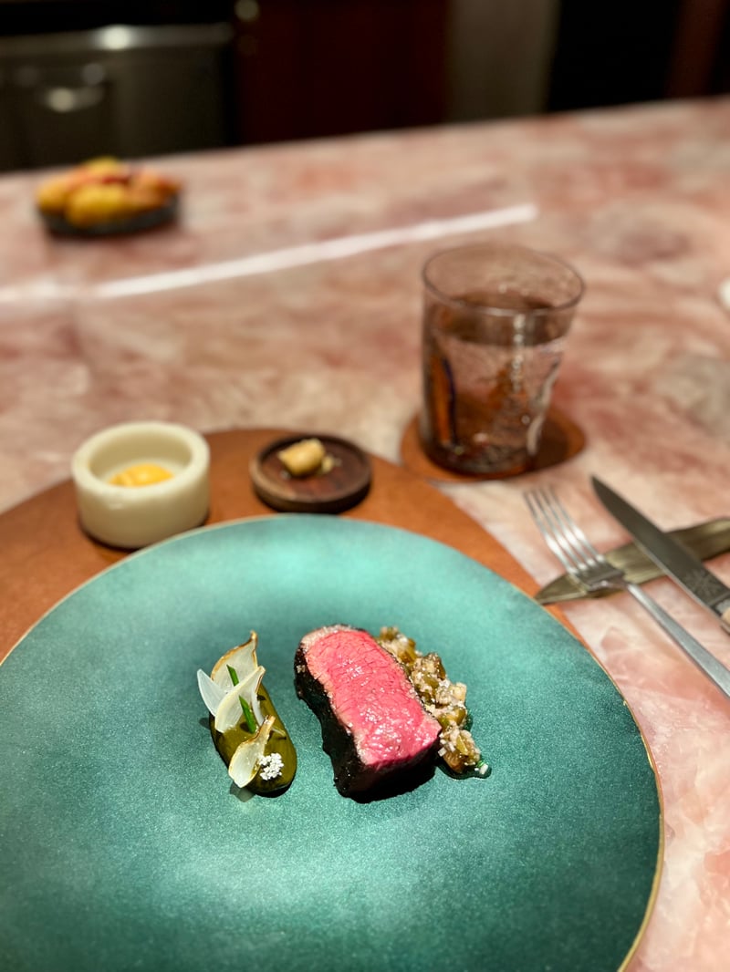 Behind its doors adorned with coppery reflections, located in the heart of Mondrian Singapore Duxton, Araya reveals a haven where design and light converse with subtle elegance. The pink quartz counter, the centerpiece of this space designed by Emma Maxwell, stretches over 14 seats, inviting guests to a privileged immersion into the chefs' universe. Here, each gesture, each ingredient comes to life under the watchful eyes of the hosts, in an atmosphere that evokes the intimacy of an omakase experience. The main room, majestic, transports to a landscape with changing nuances, its gradient walls capturing the magic of sunrises and sunsets of the southern hemisphere. The dimmed lighting envelops everything in a beautiful gentleness, enhancing the textures and contrasts of the decor.