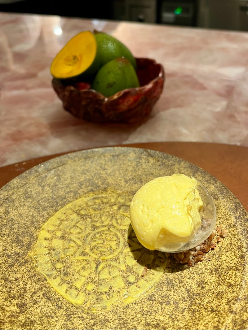 The dessert 'Lucuma' beautifully concludes the meal, paying homage to the richness of South American flavors with the incorporation of the tropical fruit lucuma, known for its naturally sweet taste reminiscent of maple syrup and sweet potato. This dessert consists of a rum ice cream that provides a creamy texture and a subtly alcoholic taste, perfectly complementing the sweetness of the lucuma. Caramelized pecans add a crunchy touch that beautifully contrasts with the sweetness of the ice cream, providing a visually captivating and deliciously satisfying conclusion to an exceptional gastronomic meal.