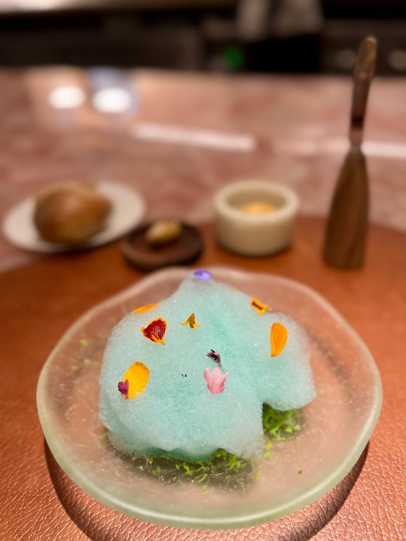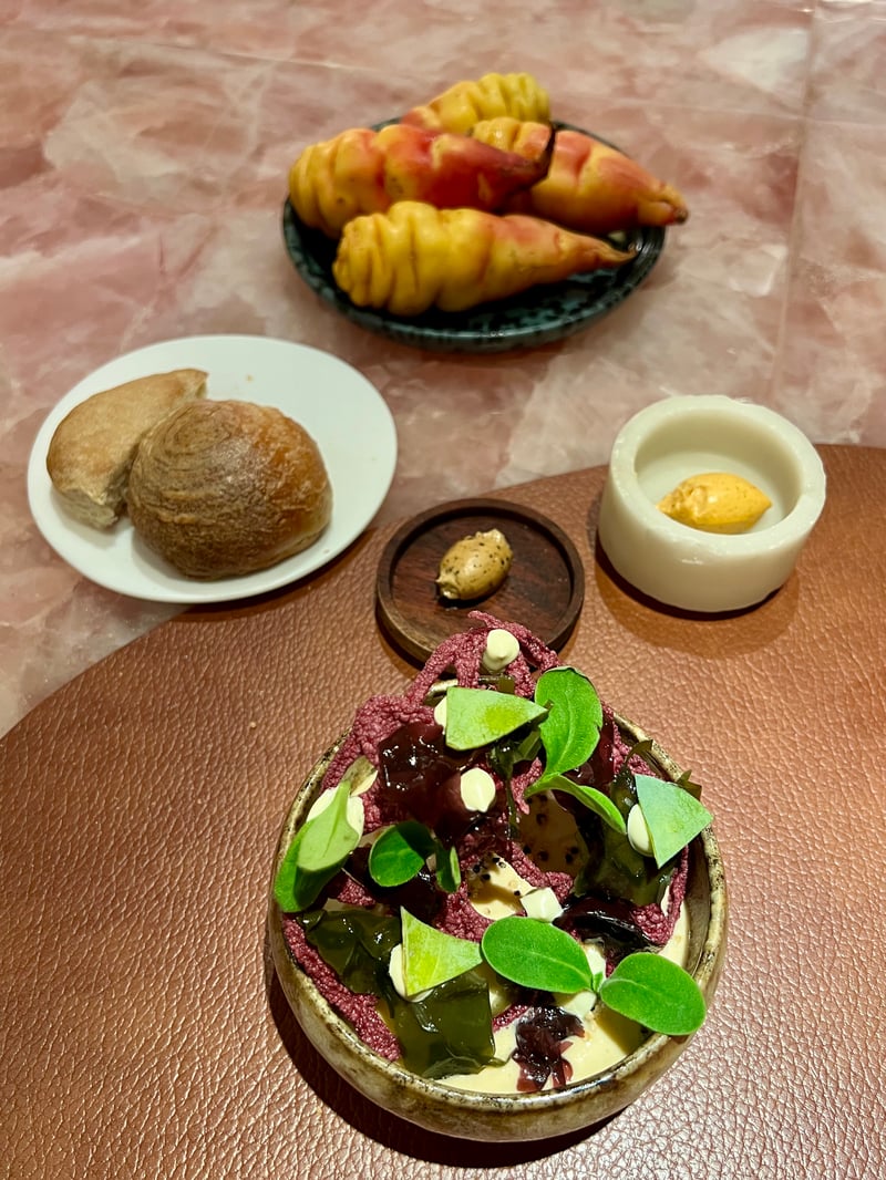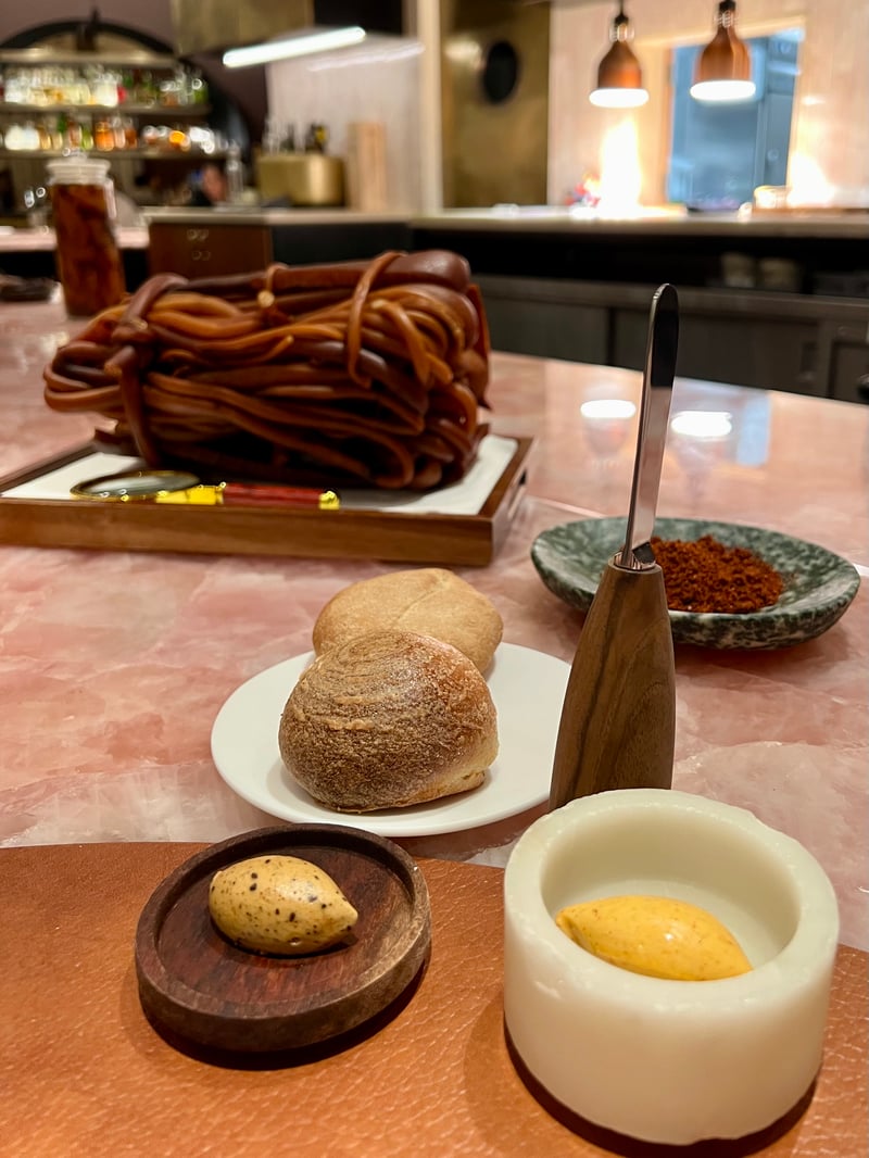 The meal continues with 'La Panera,' a delicious selection of breads, carefully prepared by Chef Fernanda Guerrero. Inspired by her childhood memories and the traditional importance of bread in South American culture, she offers a variety of creations that transport guests directly to the heart of her country's culinary traditions. The bread basket includes Marraqueta, a small bread with a particularly crispy crust and a soft interior; the Chapalele, a typical southern Chilean potato bread, offering a rich and satisfying texture; and the Bocado De Dama, a delicate preparation enriched with nori seaweed adding an elegant maritime touch. These breads are served with a range of innovative butters, such as a Uruguayan butter sprinkled with merkén, a smoked Chilean chili, and a Cochayuyo spread, an umami seaweed butter from the southern coasts, brilliantly completing this gustatory introduction.