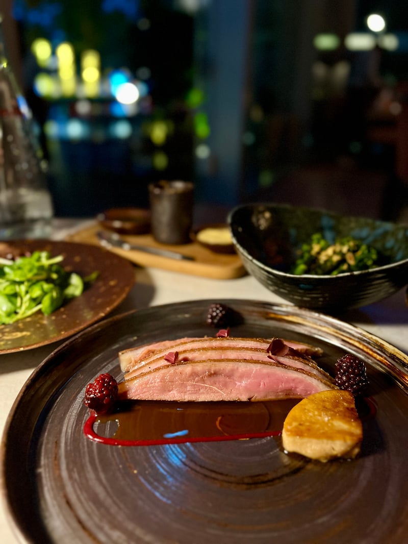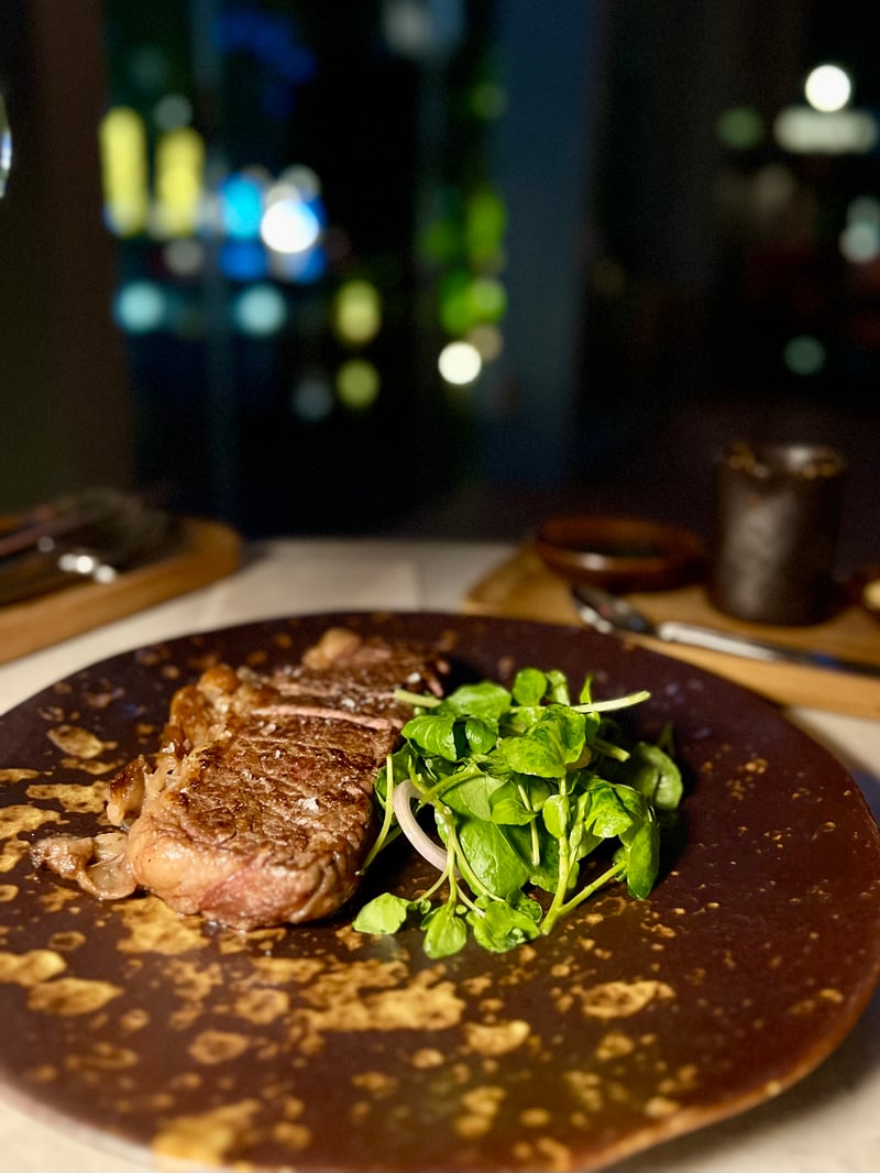 Another signature dish: Skirt's Selection of Steaks. Seared to perfection, it features a golden crust that contrasts with a juicy and tender flesh. The seasoning, discreet yet precise, highlights the exceptional quality of the product, while the grill marks reveal the passage through the open fire grill, a signature of the restaurant. A raw, direct, and elegant plate, true to Skirt's philosophy: magnifying pure taste through impeccable technical mastery. The beef pieces are aged on-site for 28 days, while the hamachi and duck are respectively aged for 4 and 8 days — a clear commitment to flavor, texture, and authenticity.