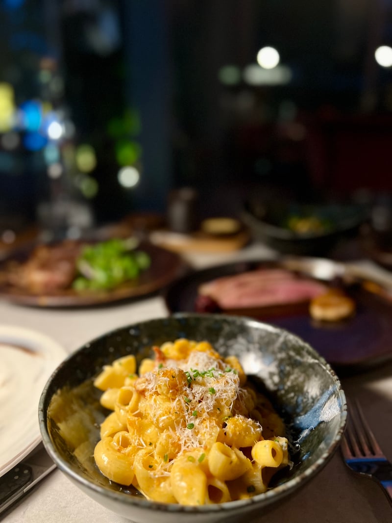 On the side, the grilled Hispi cabbage offers a texture that is both tender and crunchy. Golden croutons add crunchiness, while a generous cloud of grated cheese wraps it all in a savory and subtly salty note. A meticulously crafted dish that reveals the richness of a humble ingredient. The Lobster Mac & Cheese embodies a comforting luxury: al dente pasta coated in a creamy cheese sauce, enhanced with generous pieces of lobster. The marine sweetness of the crustacean contrasts beautifully with the creamy richness of the dish, for a result as elegant as it is delicious. Finally, the grilled broccolini plays the card of simplicity: grilled slivered almonds add crunchiness and a touch of roundness, while a delicate seasoning underlines the purity of this sublime vegetable.
