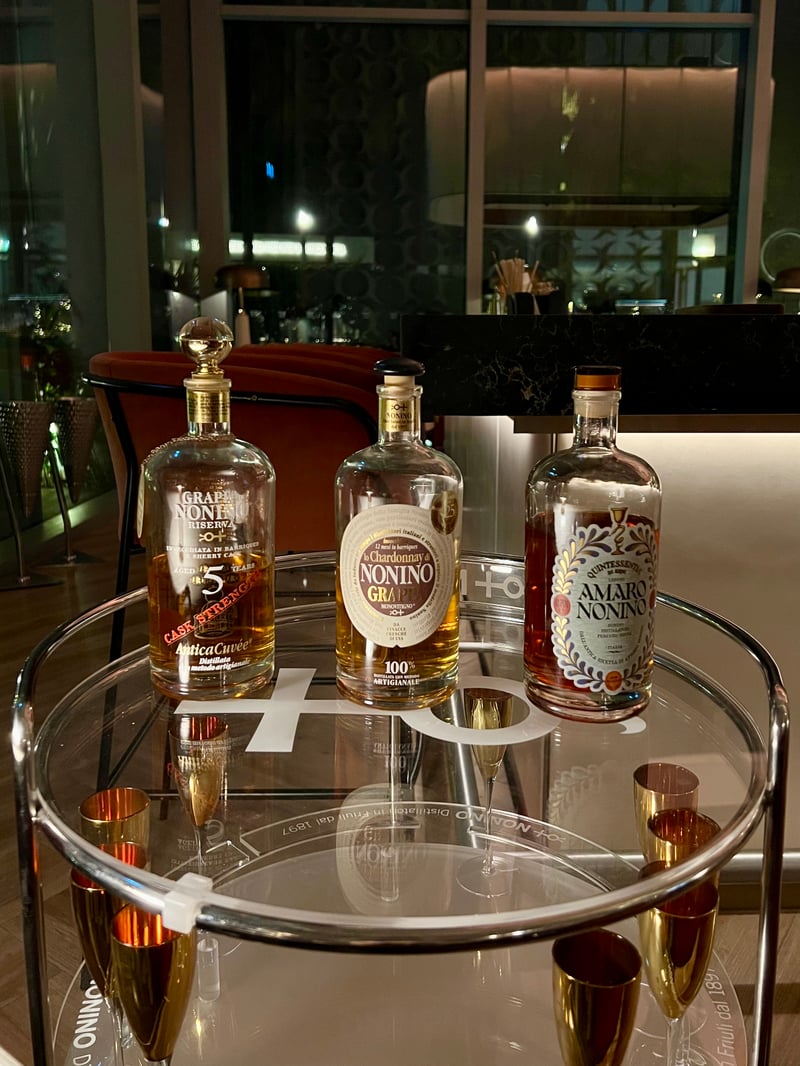 The Smoked Cheesecake, meanwhile, captivates with its boldness and finesse. Crowned with roasted pineapple, lightly caramelized, it blends fruity and grilled notes with the richness of the cheesecake. A smoked whipped cream adds an airy lightness, while dried fruit shards add color, acidity, and texture. The whole rests on a crispy shortbread, for a perfectly balanced finale. These desserts are accompanied by a glass of Grappa Nonino, the ultimate touch of panache to conclude this exceptional dinner.