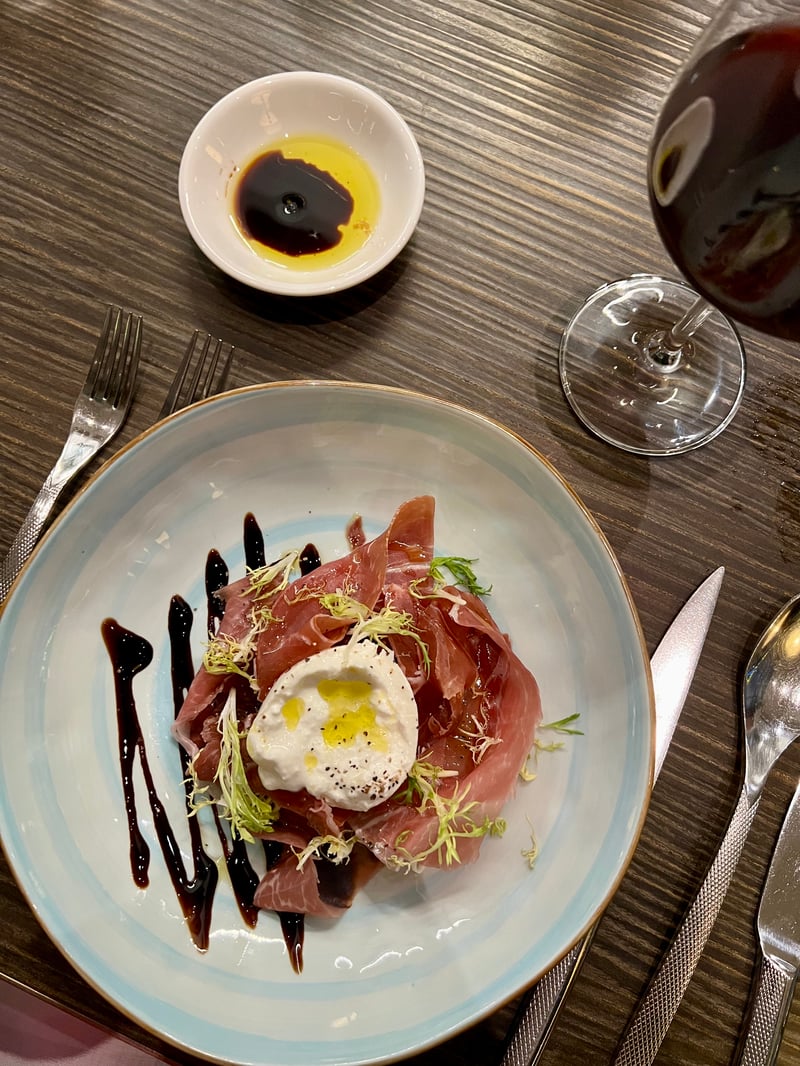 As an opener, we chose two antipasti as elegant as they were delicious. The finely sliced Parma ham, arranged in a rosette, paired perfectly with a creamy burrata and a drizzle of balsamic reduction, for a starter full of softness and balance. Simultaneously, the grilled octopus, served on a lively arrabbiata sauce and punctuated with pesto and marinated onions, offered a bolder and contrasting experience, between power, freshness, and delicacy of texture.