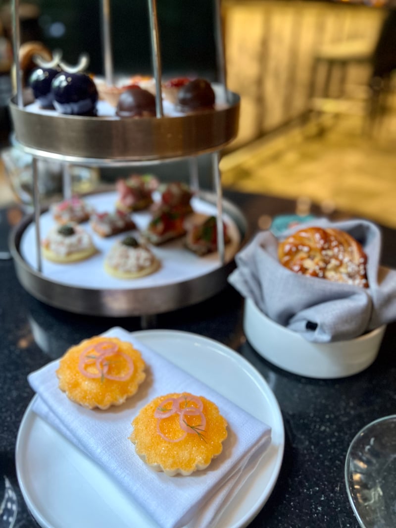 The Nordic Afternoon Tea experience is a true celebration of the senses, a delicate harmony of Nordic flavors and refined pastry elements. Presented on an elegant three-tiered stand, the service offers a variety of sweet and savory delights that enchant both the eye and the palate. We begin with a Kalix Löjrom Tart, served as an amuse-bouche, distinguished by its meticulous presentation. The whitefish caviar rests on a bed of Gruyère cream, accompanied by pickled onions and chives, forming a delicate and well-balanced combination of flavors.