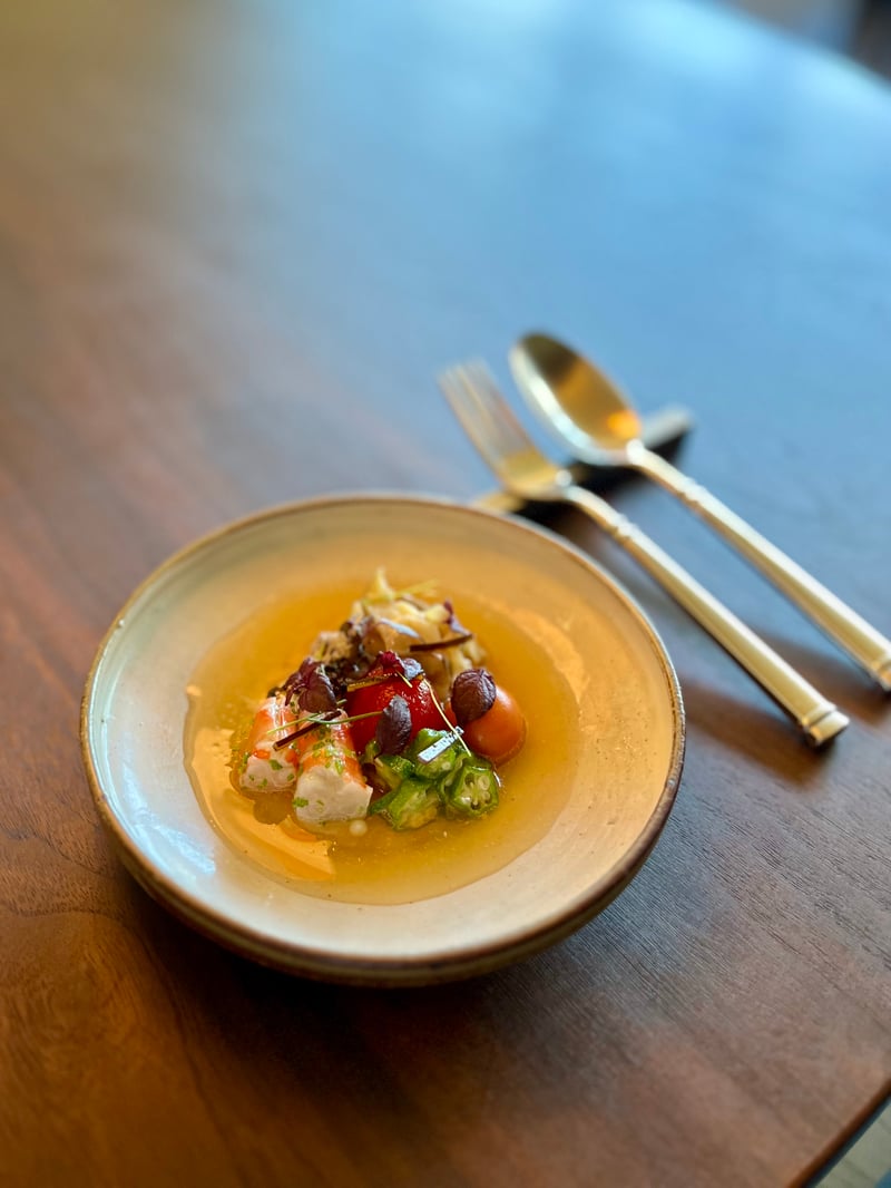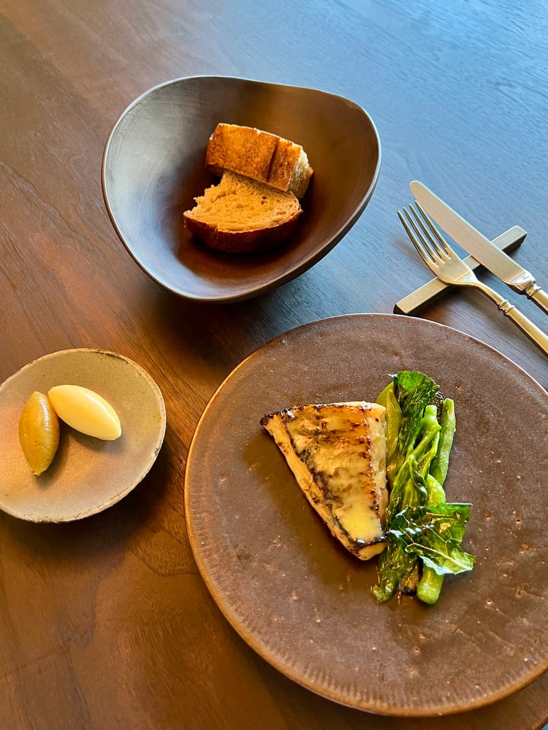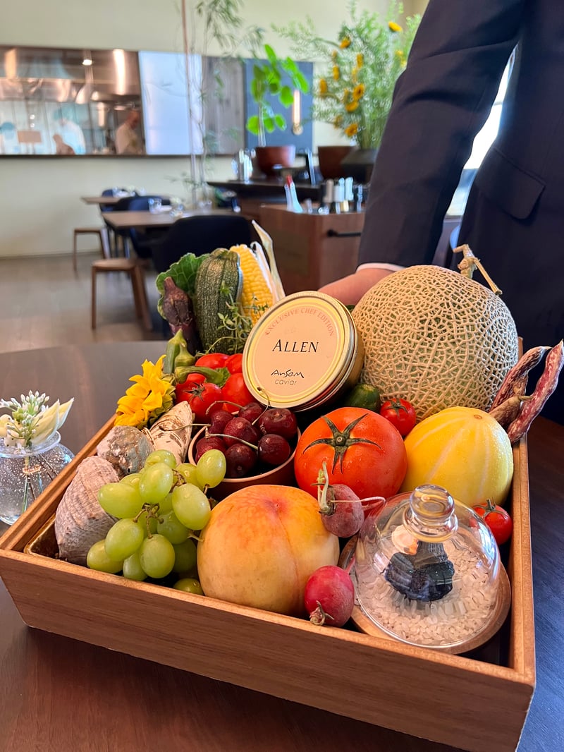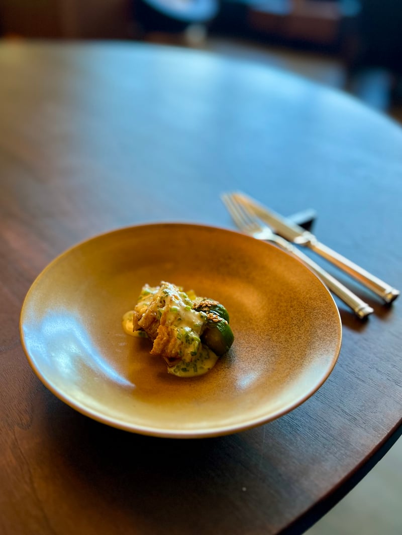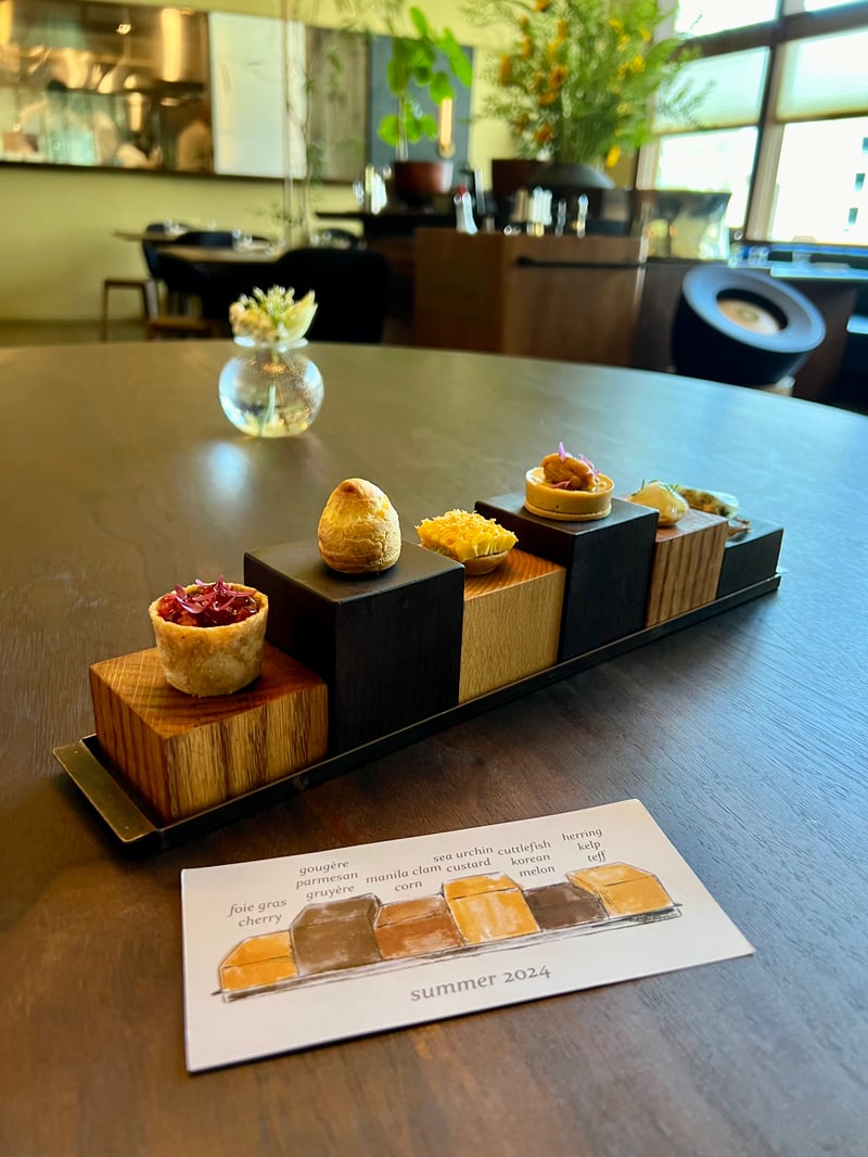 We had the privilege of dining at the restaurant Allen for an exceptional lunch. After a detailed presentation of the seasonal ingredients that would enhance our meal, we began the experience with a selection of amuse-bouches presented on wooden trays, thus elevating the visual aspect of the dishes. This culinary journey began with typically French flavors such as foie gras or even gougères, mixed with Korean touches, such as Korean melon. A refined and promising start.