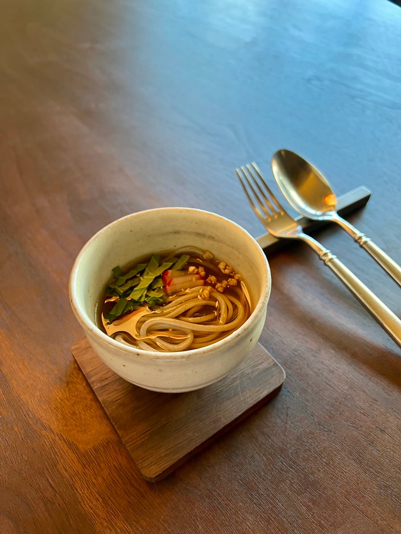 We continued this marine exploration with a sole enhanced by a red wine sauce and bell pepper. This bold pairing of red wine, typically reserved for meat, brought unexpected depth to the delicacy of the sole. Cold soba noodles in a light broth then offered a delicate pause.