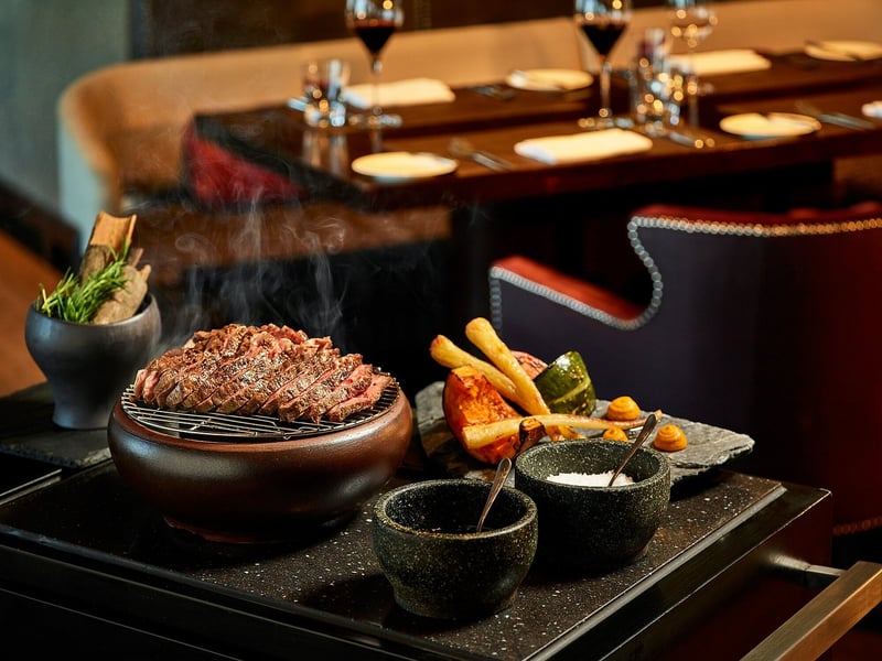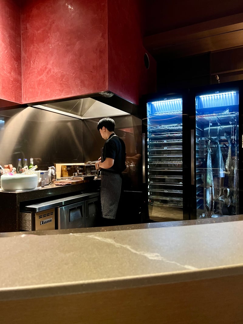 The intimate ambiance of the main dining room, dominated by a large rounded counter, invites conviviality, with guests seated side by side, sharing the culinary experience. In this refined atmosphere, large dry-aging machines, visible from the dining area, evoke a laboratory where every detail is controlled to ensure unique flavors. At YUN, dry-aging is not limited to beef and duck but extends to fish, mushrooms, and even some fruits, offering a palette of novel textures and flavors for an unforgettable tasting.