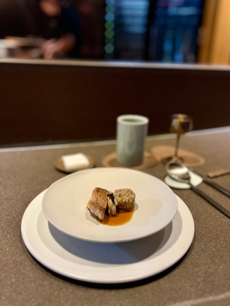 Then, the oyster makes its entrance, captivating and refined. Marinated with care, it is adorned with frozen olive oil, adding an icy freshness and touch of texture. Next come the tartlets: one with raw beef and potato, the other with eel, offering an exquisite mouthfeel. The Juk, a Korean rice porridge, then appears, enriched with fermented melon and red bean paste. The sweetness of the melon and the light aroma of the red bean give unexpected depth to this classic dish while respecting its essence.