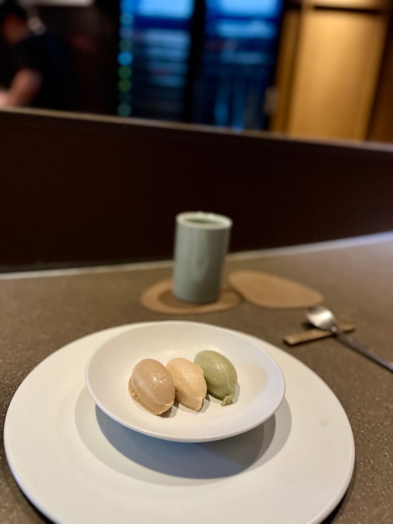 For dessert, the chef offers a selection of unique ice creams, including black garlic and deodeok, remarkable for their originality and rich flavors. This final bouquet ends with tea accompanied by sweets: a rice cake and a meringue that add a light and elegant touch to this feast. The dinner thus ends on a poetic note, leaving a memorable impression of refined, bold, and perfectly executed cuisine.