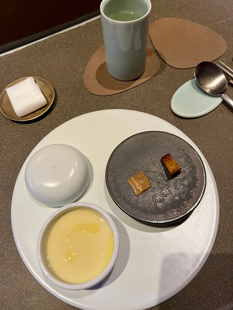 After the dumpling, the seasonal fish arrives, accompanied by various types of rice and a punchy pickle. The meal continues with a refreshing pause in the form of a peach sorbet, offering a light, fruity interlude that renews the appetite for further exploration. This sorbet leads to a pork dish of exquisite tenderness, accompanied by crunchy pickles. The melt-in-the-mouth pork contrasts beautifully with the crispness of the pickles, creating a balanced and flavorful experience.