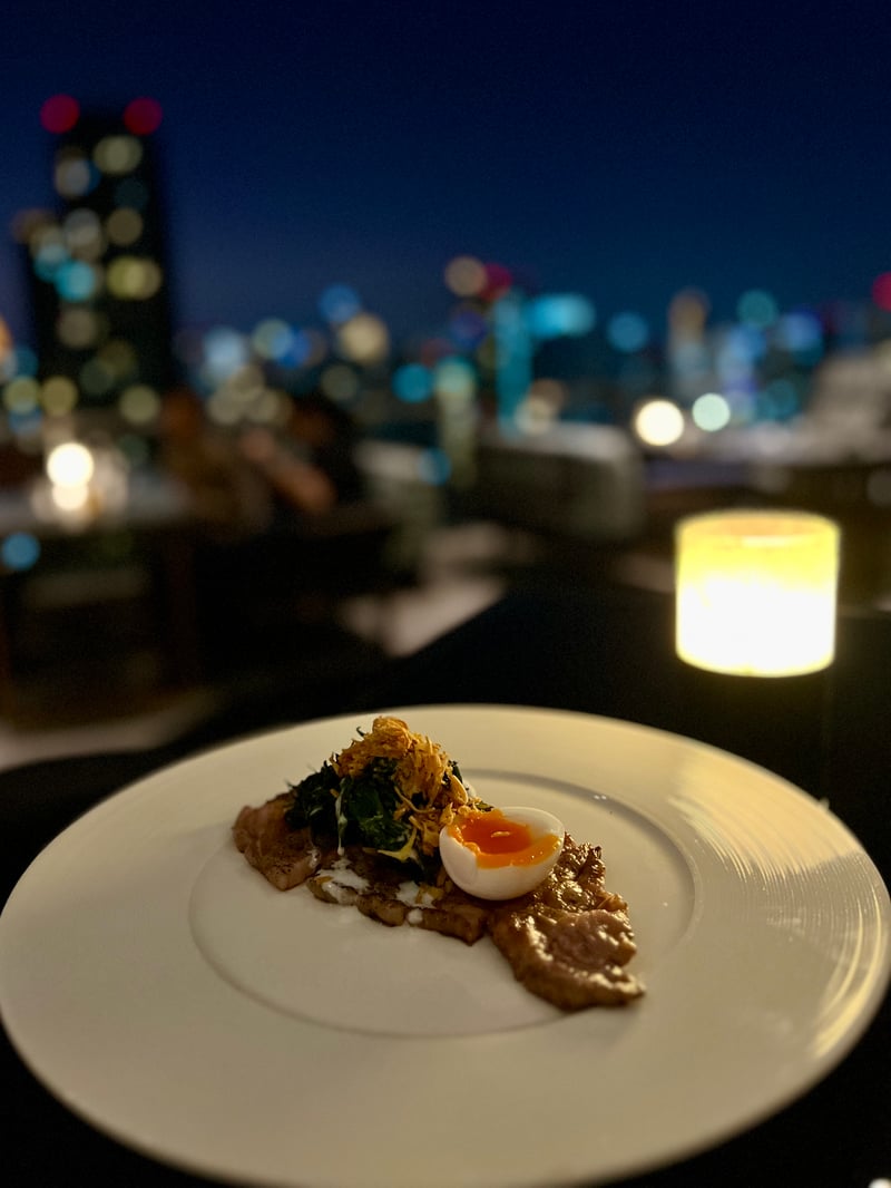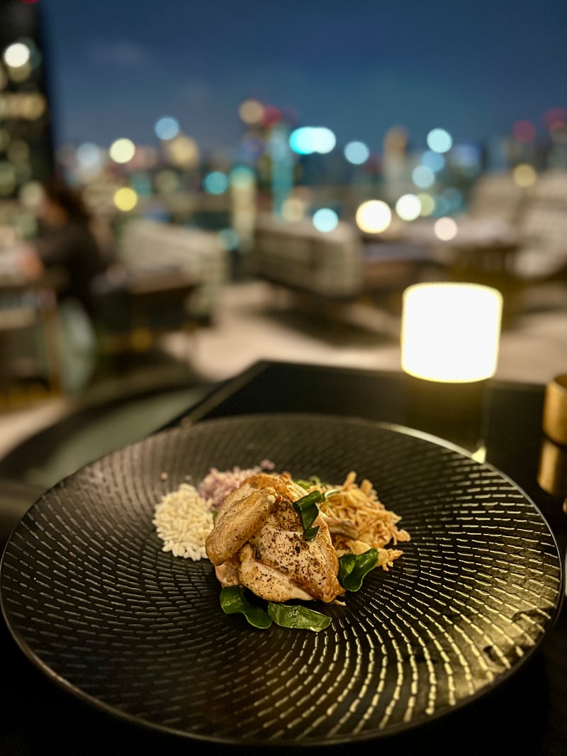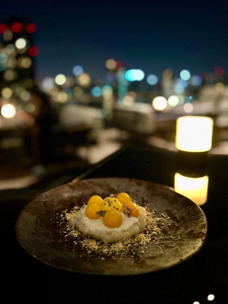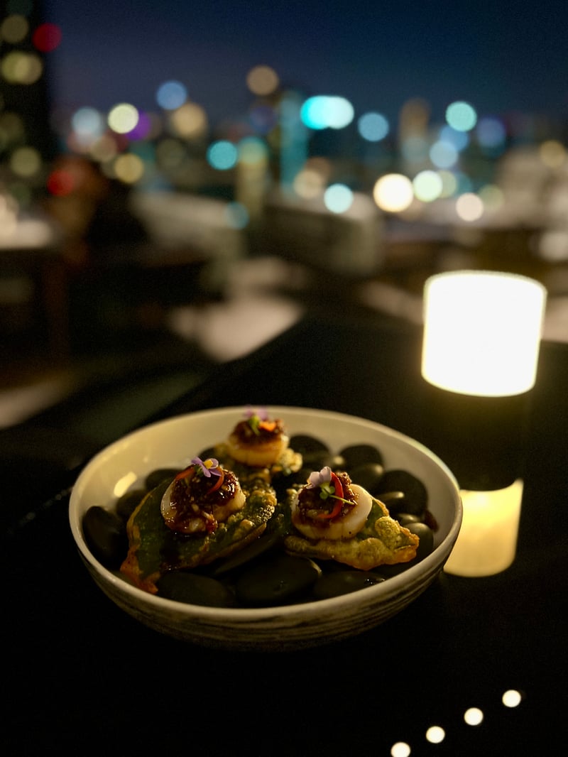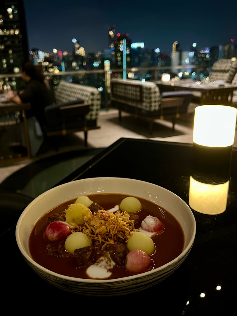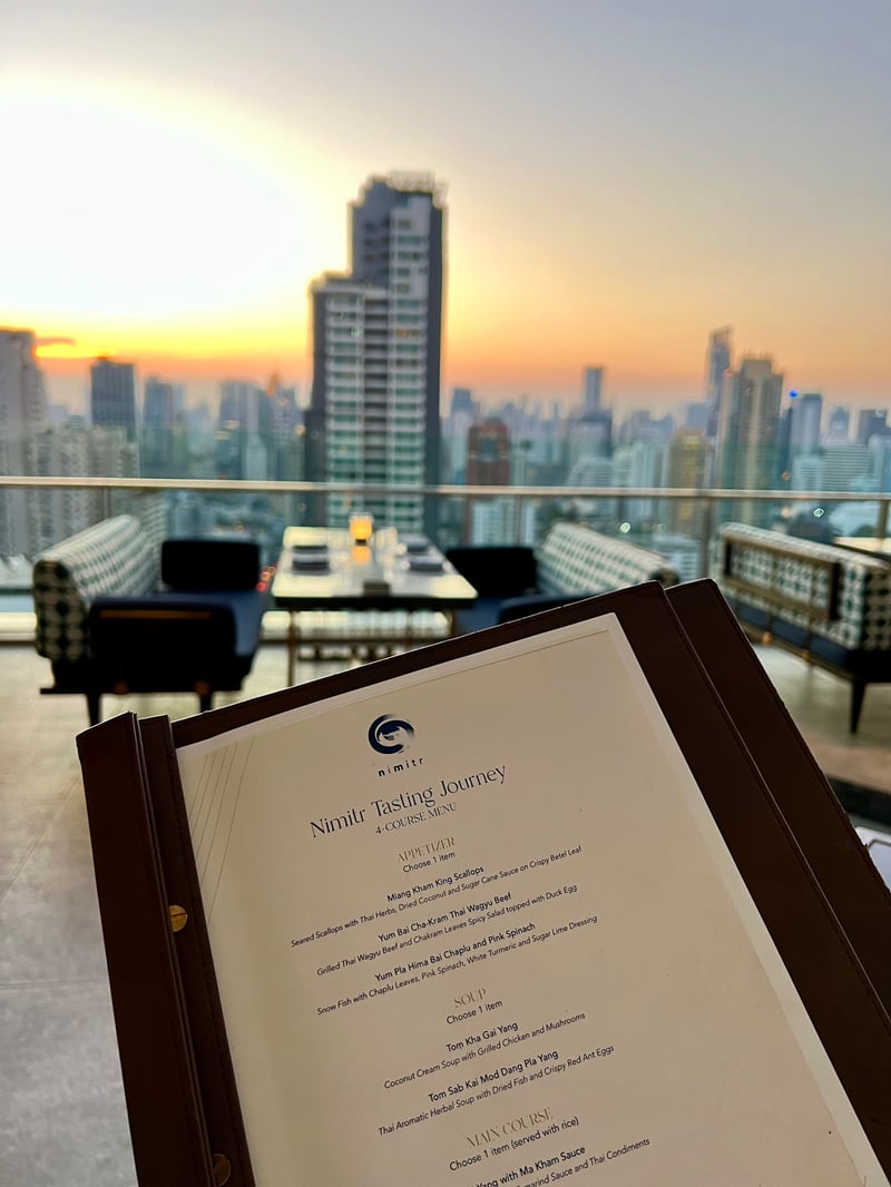 During our experience at Nimitr, we chose an outdoor dinner, enjoying the mildness of a February evening, accompanied by a panoramic view of Bangkok. The menu, rich in flavors, takes advantage of the benefits of Thai herbs and spices, offering an à la carte option or a four-course menu, for which we opted.