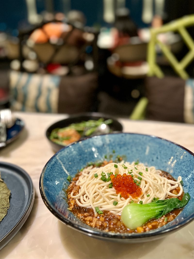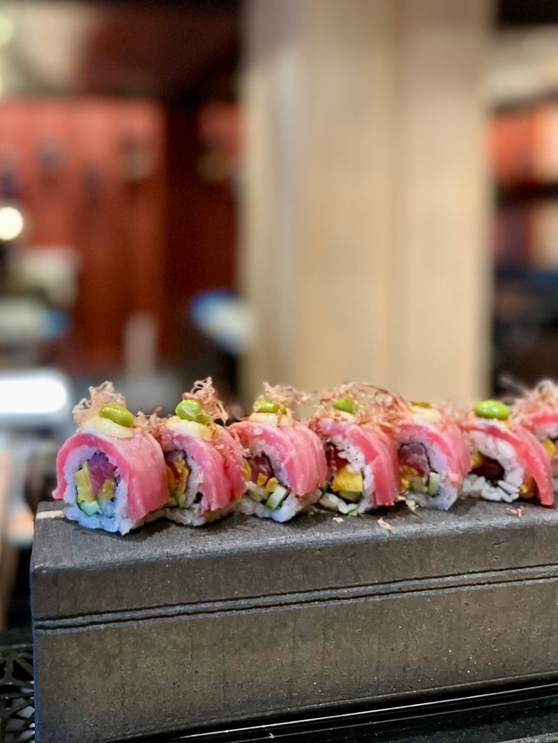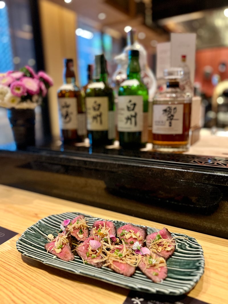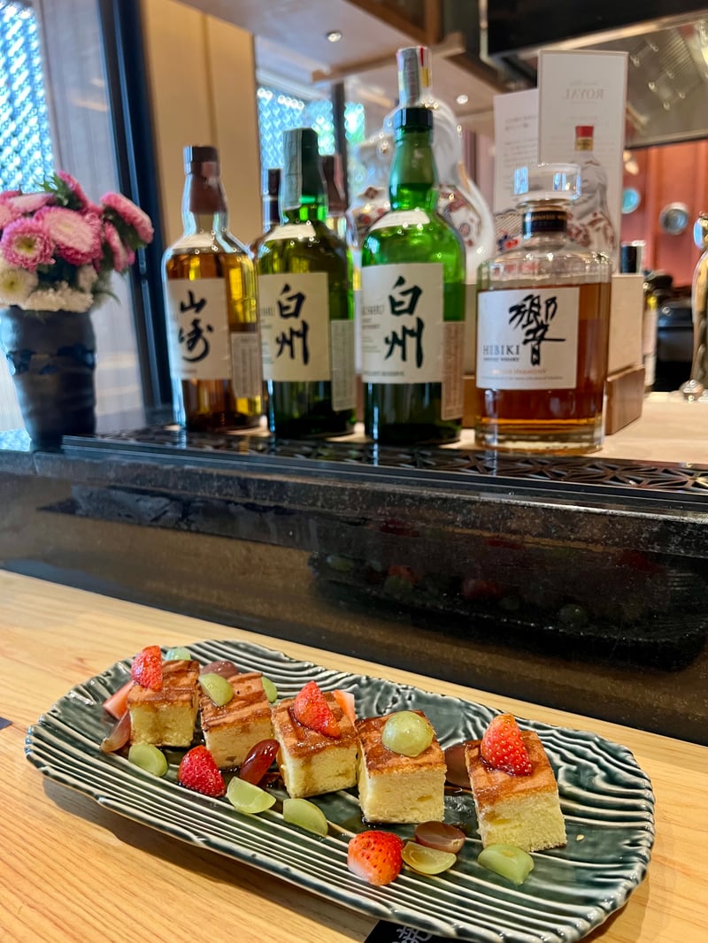 Our lunch at Chi Izakaya was an immersion in a vibrant and warm universe. The menu highlights dishes prepared with binchotan charcoal for its unique fragrance. We chose the gyu tataki, delicately roasted wagyu accompanied by ponzu sauce, the ishimi masumori, an assortment of sashimi, and the tuna maki sushi, consisting of seven pieces of tuna maki. We also enjoyed the takowasabi & tai shiokara, wasabi octopus and salted snapper belly, the dashimaki tamago, a Japanese omelette, and our favorite, the karubi yaki, beef ribs with a special soy sauce that stands out for its tenderness and exquisite taste. The meal concluded on a sweet note with the kasutera, a cake of Portuguese origin that has become a famous specialty in Japan.
