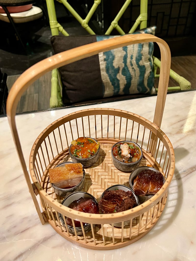 The dinner started with one of the restaurant's signature dishes, the Shanghai 6 Elements platter, consisting of roasted duck, soy sauce cod, chicken salad, crispy pork, BBQ pork, and jellyfish salad. This dish immediately immersed us in the beloved Cantonese flavors. The meal then continued with a fried fish wrapped in oolong tea leaves and soy sauce, presented on a lotus leaf, accompanied by sticky rice with royal scallops, Beijing-style noodles, and green beans fried with dried tofu. To conclude on a refreshing note, we opted for a chrysanthemum tea poached pear accompanied by bird's nest, a highly prized Cantonese specialty.