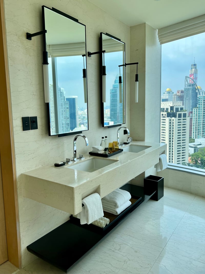 During our stay in a King Deluxe room, we were charmed by the generous space of 55 square meters, combining a king-size bed with a cozy seating area. The ambiance is decidedly modern and chic, marked by clean lines and traditional Thai accents. The panoramic view of Bangkok completes this picture, which can be admired from the room as well as from the bathroom. Ultra-spacious, it feels like an exclusive spa with its soft lighting, bathtub, and rain shower inviting moments of absolute relaxation, all complemented by Le Labo toiletries.
