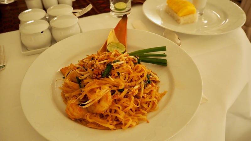 For dinner, we opted for Triptara to enjoy Thai cuisine in an enchanting setting: on the banks of the river, in the heart of a lush garden, tables are placed here and there for a romantic backdrop. Small Thai teak houses offer a few tables, but most guests settle on the edge of the bank, illuminated only by the gentle candlelight. Among the signature dishes, Som Tum papaya salad is a delight, as is the famous Pad Thai. There are also à la carte soups as well as tasty curries. As for dessert, tropical fruits are a highlight of the sweet dishes, with mango and coconut milk rice being a wonderful example.